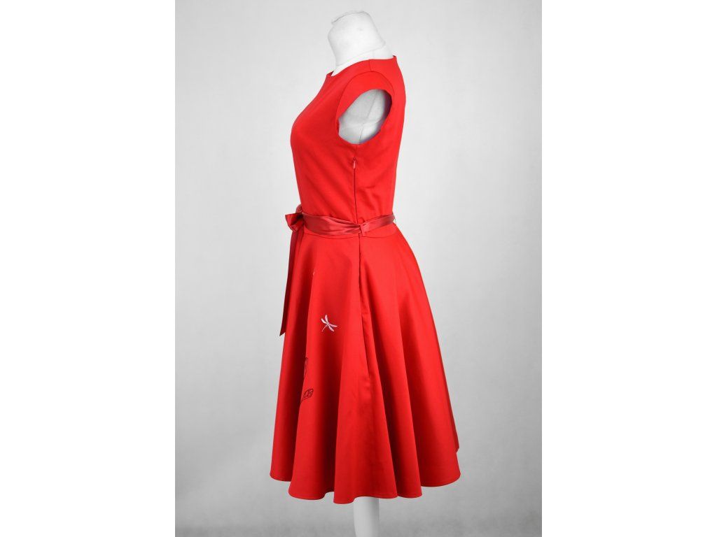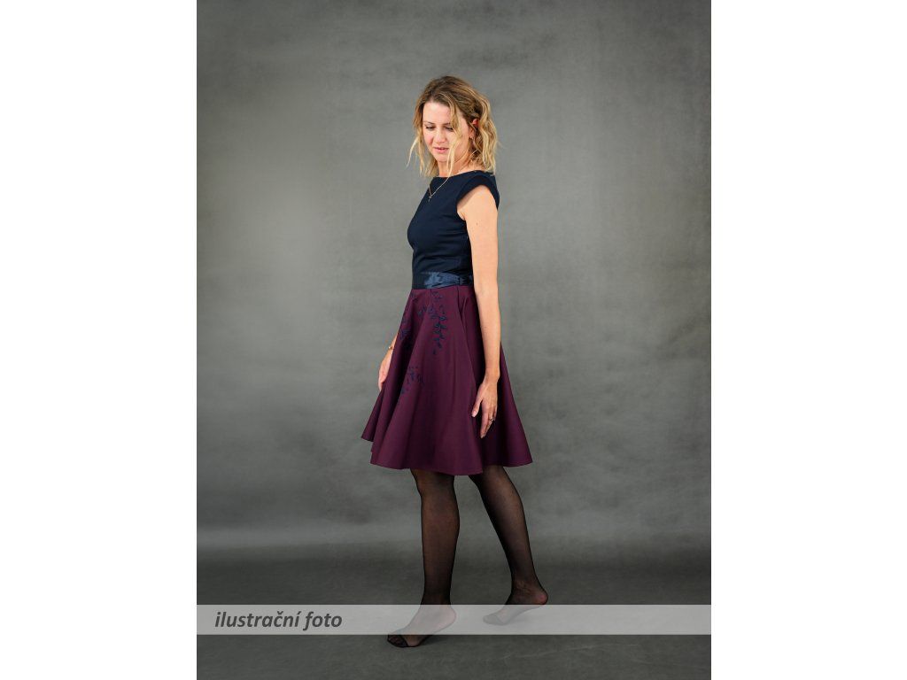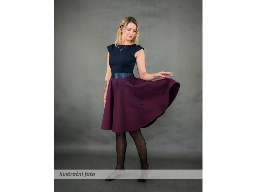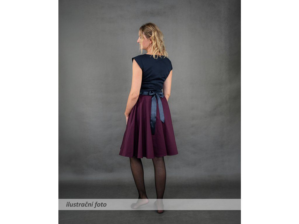 Dámské kolové šaty s krátkým rukávkem. Ten je tvarován tak, aby průramky neškrtily a při zvednutí rukou šaty netáhly a byla možnost volného pohybu. Jsou tvarované záševky a středem zadního dílu. Průkrčník je začištěn podsádkou, na boku skrytý zip a skryté kapsy. Nemají příliš hluboký výstřih, pas je trochu zvýšený, sukně je bohatá, kolová… :) Stuha je součástí produktu.