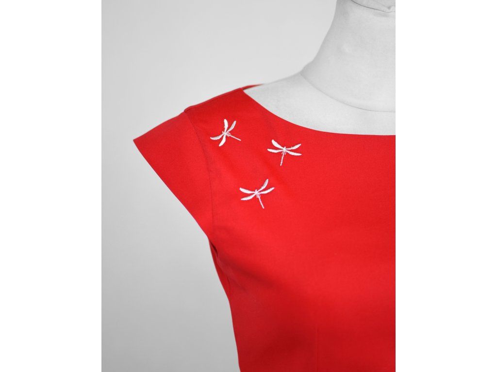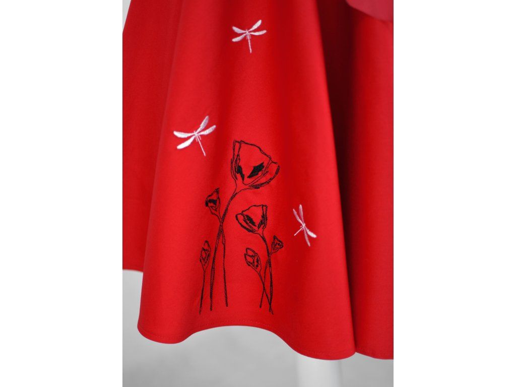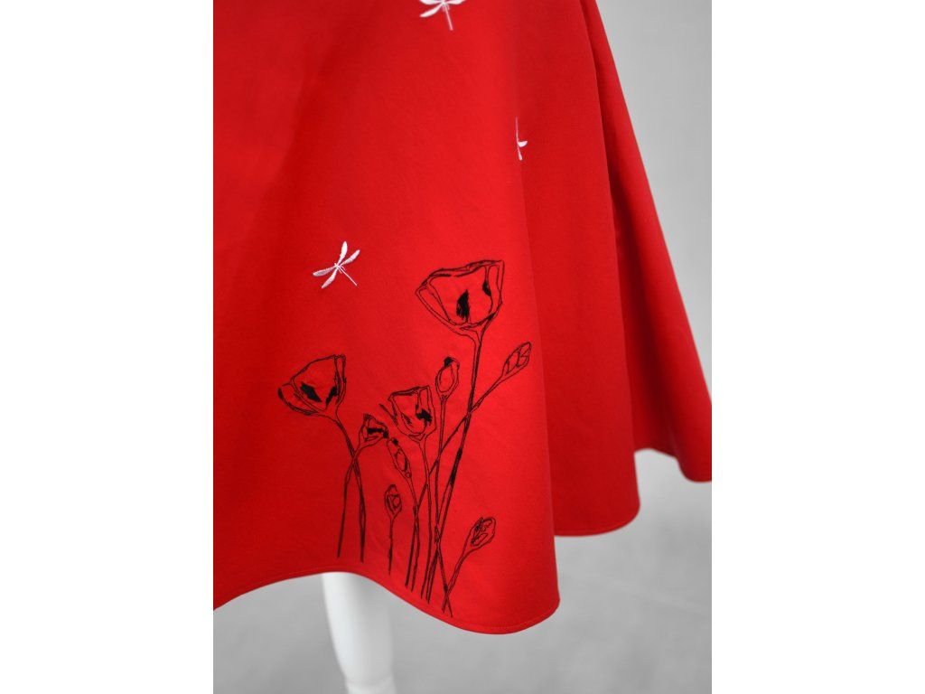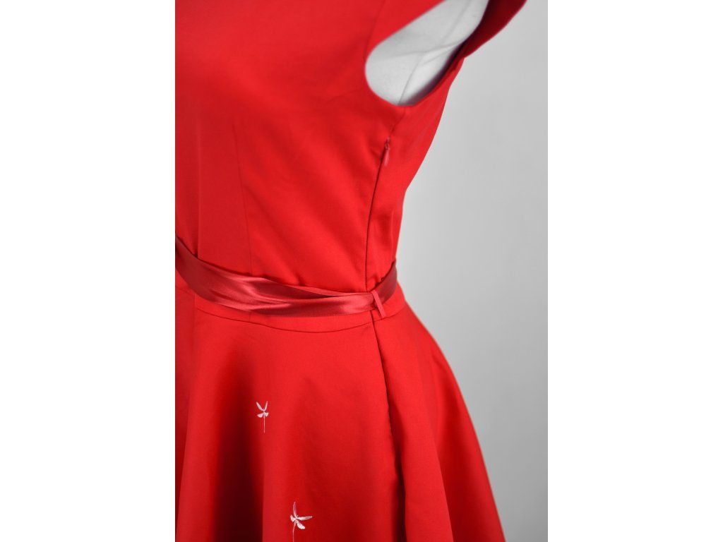 Dámské kolové šaty s krátkým rukávkem. Ten je tvarován tak, aby průramky neškrtily a při zvednutí rukou šaty netáhly a byla možnost volného pohybu. Jsou tvarované záševky a středem zadního dílu. Průkrčník je začištěn podsádkou, na boku skrytý zip a skryté kapsy. Nemají příliš hluboký výstřih, pas je trochu zvýšený, sukně je bohatá, kolová… :) Stuha je součástí produktu.