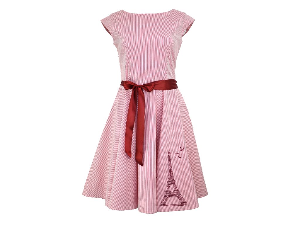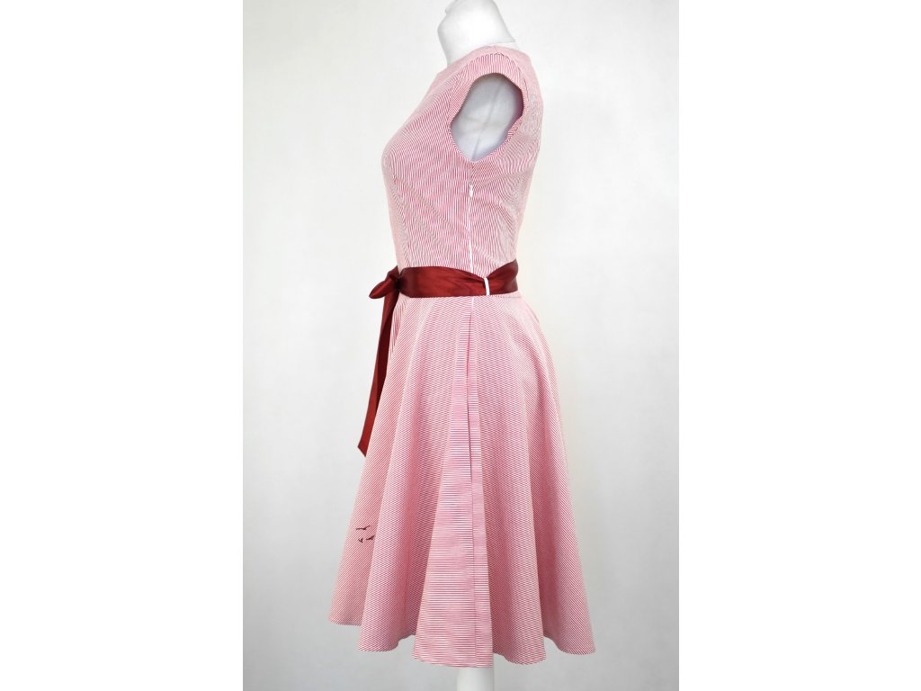 Dámské kolové šaty s krátkým rukávkem. Ten je tvarován tak, aby průramky neškrtily a při zvednutí rukou šaty netáhly a byla možnost volného pohybu. Jsou tvarované záševky a středem zadního dílu. Průkrčník je začištěn podsádkou, na boku skrytý zip a skryté kapsy. Nemají příliš hluboký výstřih, pas je trochu zvýšený, sukně je bohatá, kolová… : )