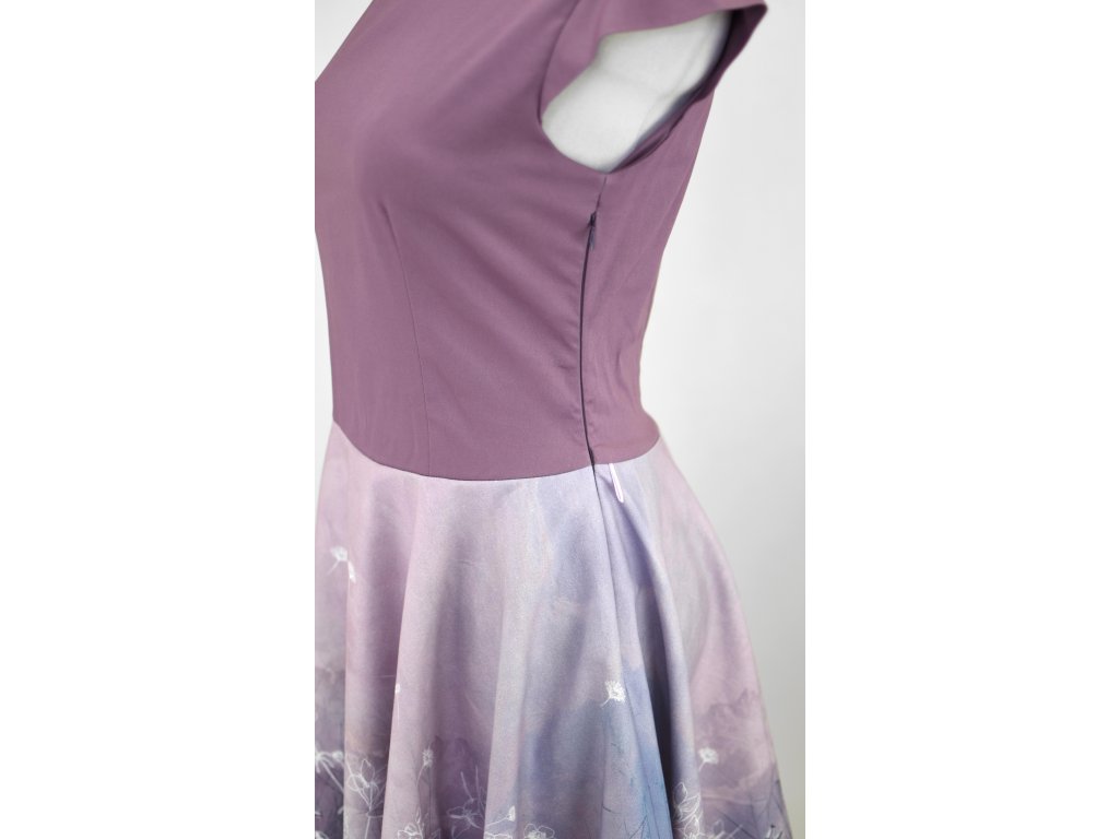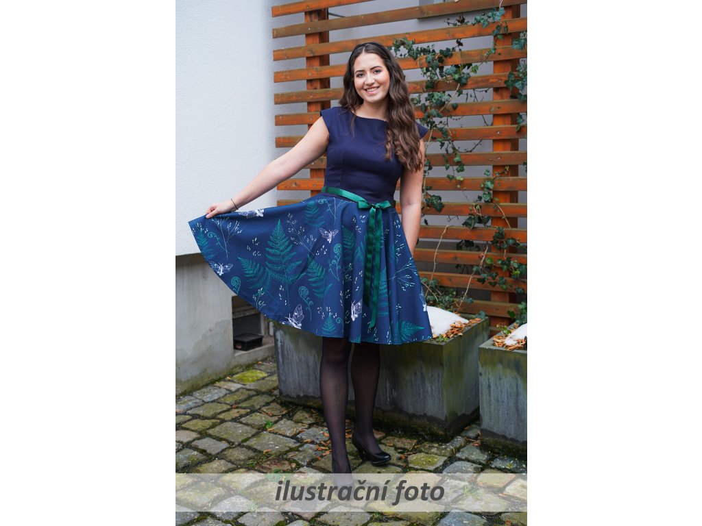 Dámské kolové šaty s krátkým rukávkem. Ten je tvarován tak, aby průramky neškrtily a při zvednutí rukou šaty netáhly a byla možnost volného pohybu. Jsou tvarované záševky a středem zadního dílu. Průkrčník je začištěn podsádkou, na boku skrytý zip a skryté kapsy. Nemají příliš hluboký výstřih, pas je trochu zvýšený, sukně je bohatá, kolová… : )