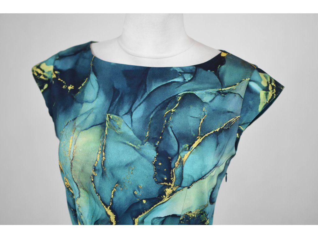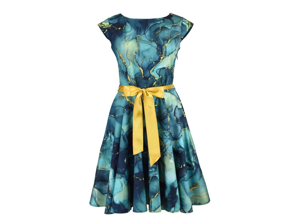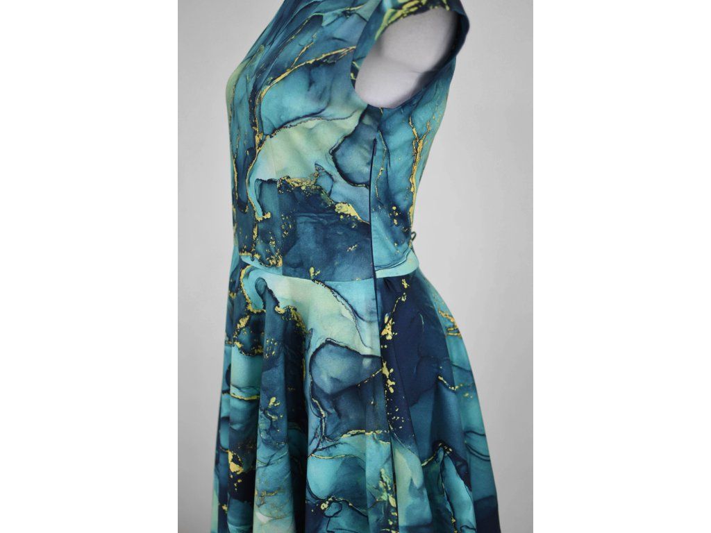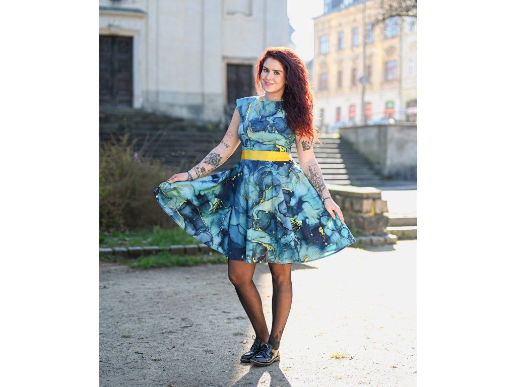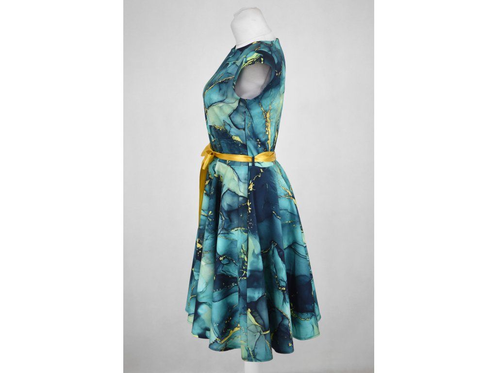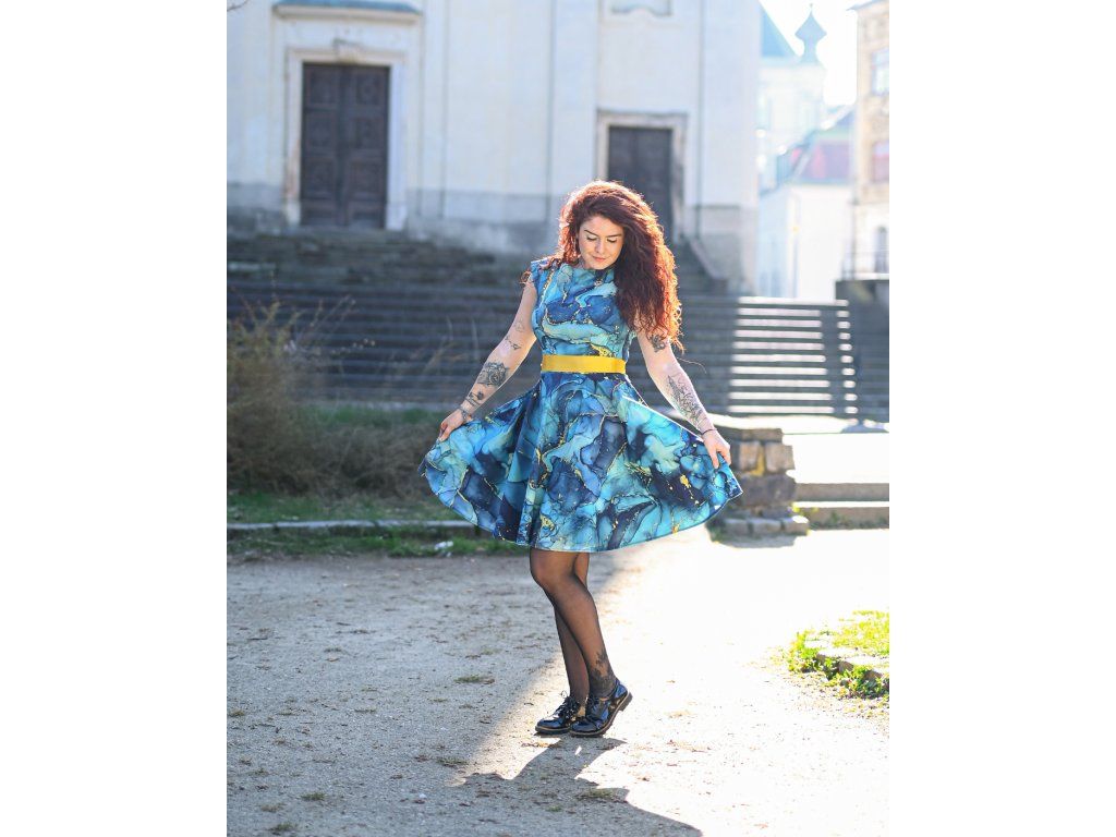 Dámské kolové šaty s krátkým rukávkem. Ten je tvarován tak, aby průramky neškrtily a při zvednutí rukou šaty netáhly a byla možnost volného pohybu. Jsou tvarované záševky a středem zadního dílu. Průkrčník je začištěn podsádkou, na boku skrytý zip a skryté kapsy. Nemají příliš hluboký výstřih, pas je trochu zvýšený, sukně je bohatá, kolová… :) Stuha je součástí produktu.