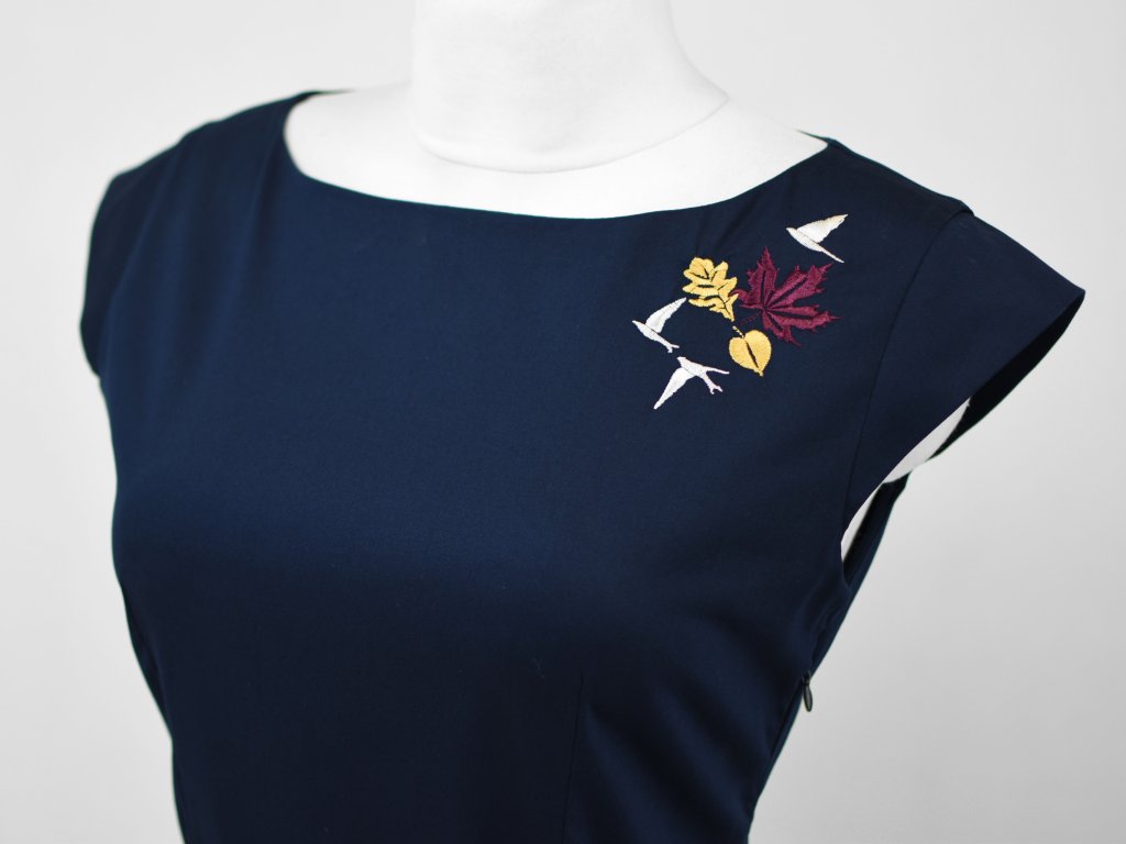 Dámské kolové šaty s krátkým rukávkem. Ten je tvarován tak, aby průramky neškrtily a při zvednutí rukou šaty netáhly a byla možnost volného pohybu. Jsou tvarované záševky a středem zadního dílu. Průkrčník je začištěn podsádkou, na boku skrytý zip a skryté kapsy. Nemají příliš hluboký výstřih, pas je trochu zvýšený, sukně je bohatá, kolová… : ) Stuha je součástí produktu.