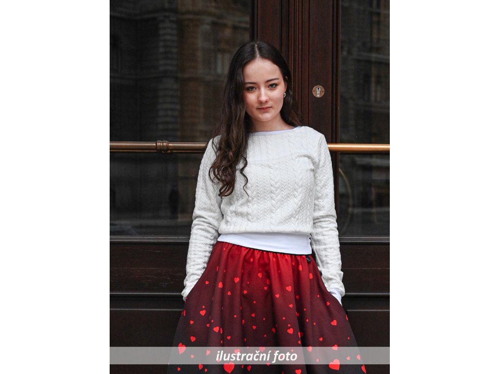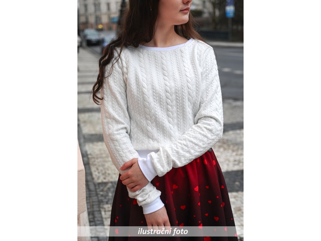 - Materiál: 81 % polyester + 16 % viskóza + 3 % elastan - elastický úplet, se strukturou copánků, z rubu hladký