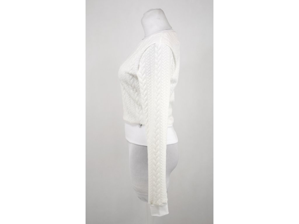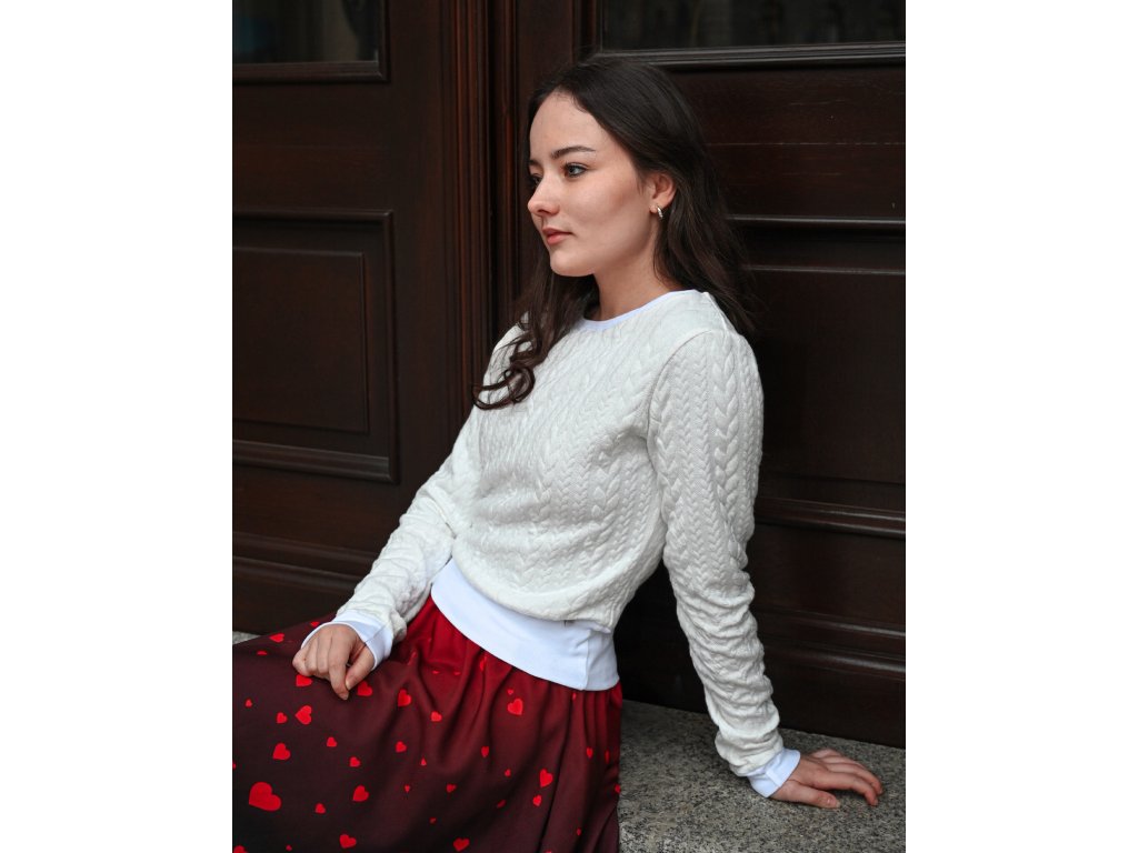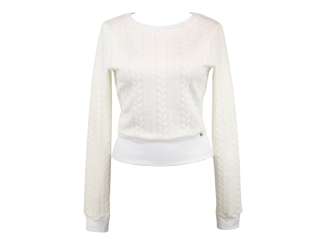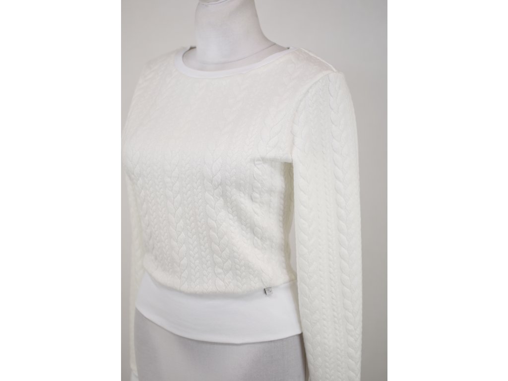 Dámská mikina zkrácené délky do pasu, vhodná ke kolovým a pasovým sukním... :) Průkrčník, dolní lem a rukávy jsou lemovány úpletem.