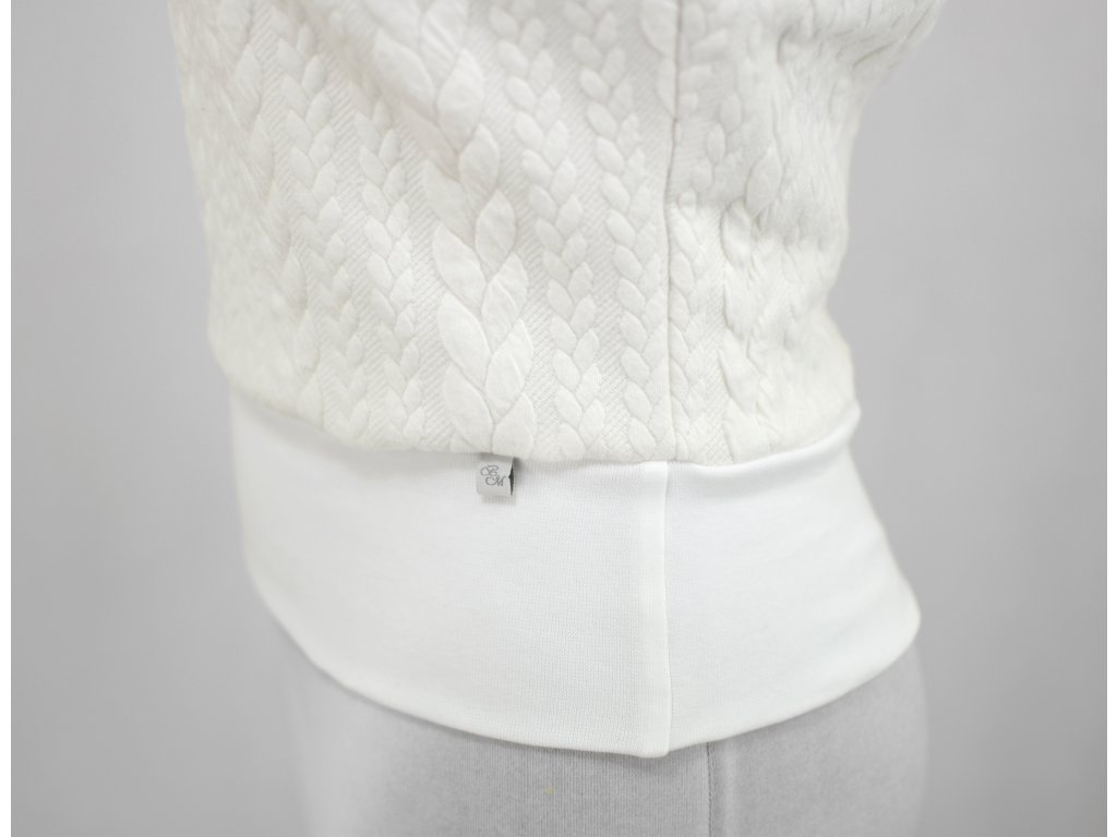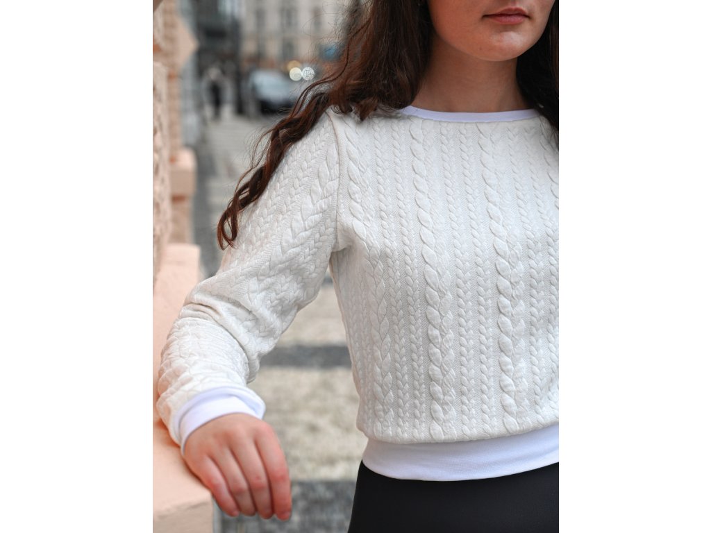 • Materiál: 81 % polyester + 16 % viskóza + 3 % elastan - elastický úplet, se strukturou copánků, z rubu hladký