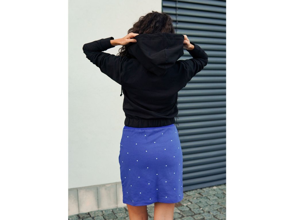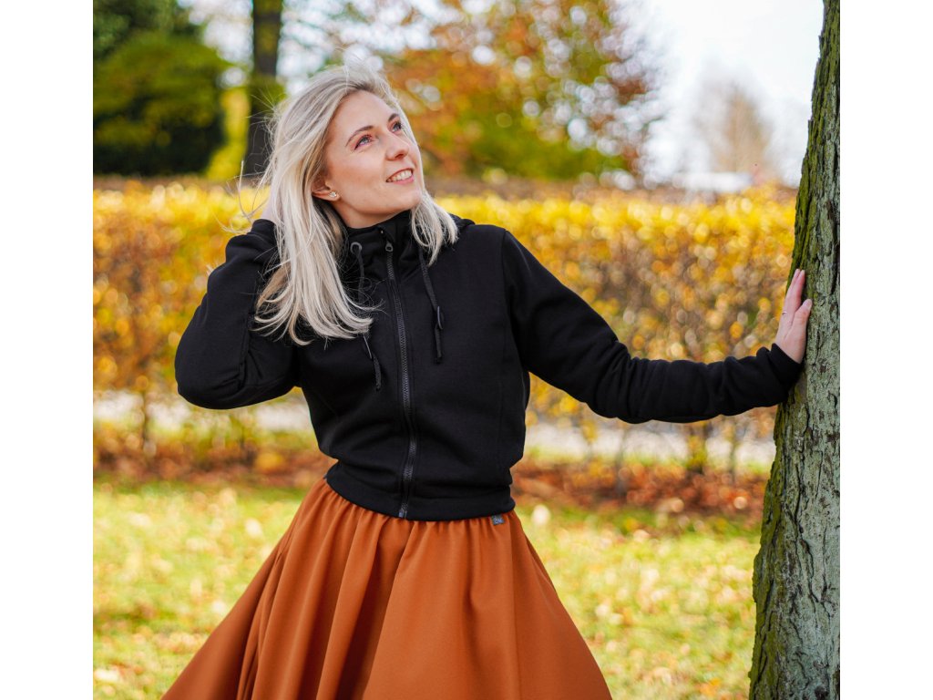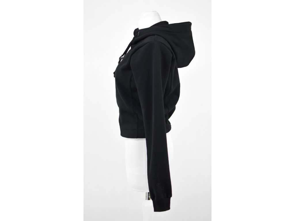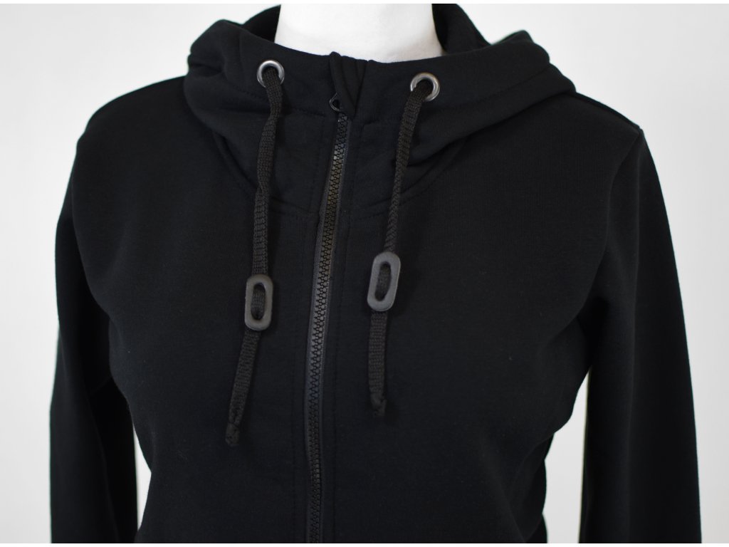 Dámská krátká mikina do pasu z příjemné počesané teplákoviny se zapínáním na zip. Má středně velkou kapuci, dá se stahovat šňůrkami. Zip je jednocestný, s chráničem brady. Na zadní straně je v dolním lemu v bocích guma, která tvaruje mikinu a stahuje spodní část.