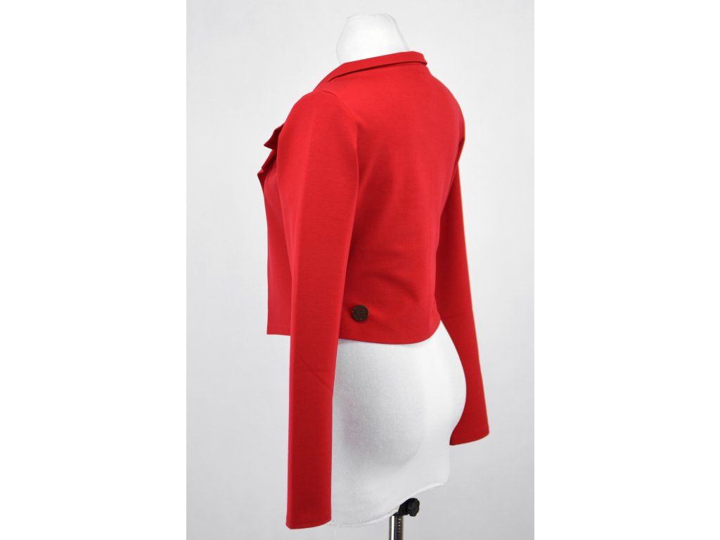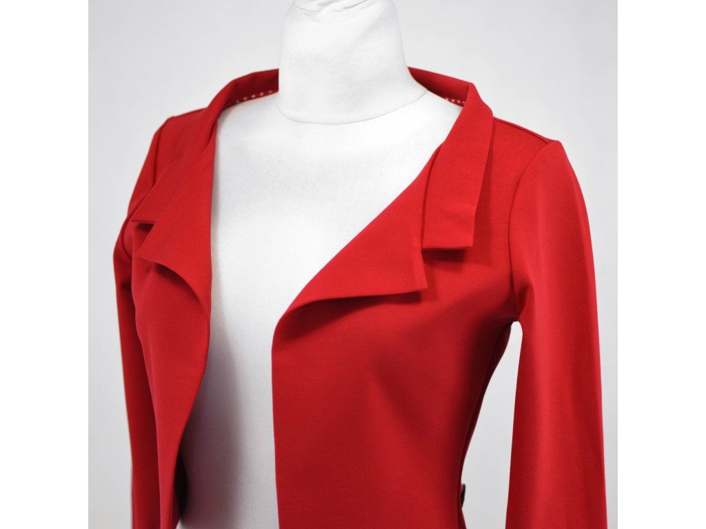 Elegantní i volnočasové krátké sáčko otevřeného střihu bez zapínání, s dlouhými rukávy. Zadní díl je lehce prodloužený tvarovaný do oblouku. Vhodné ke kolovým a pasovým sukním. Dobře se kombinuje i s dalšími druhy oblečení, třeba se společenskými šaty. Ozdobná etiketa našitá na zadním boku nesmí přijít do sušičky.