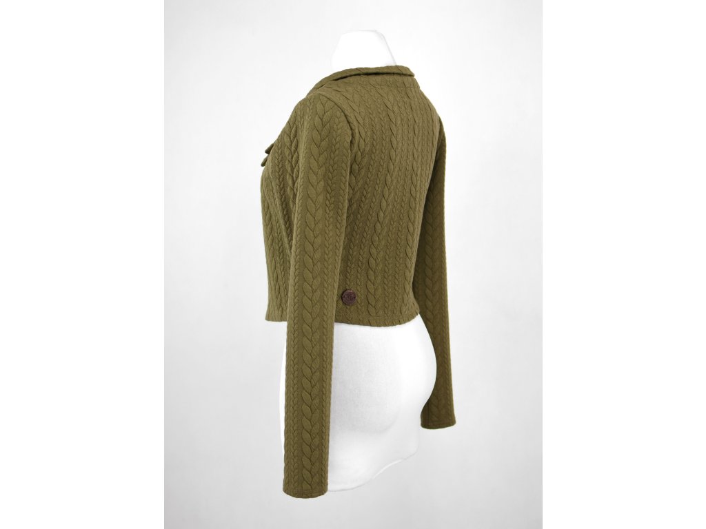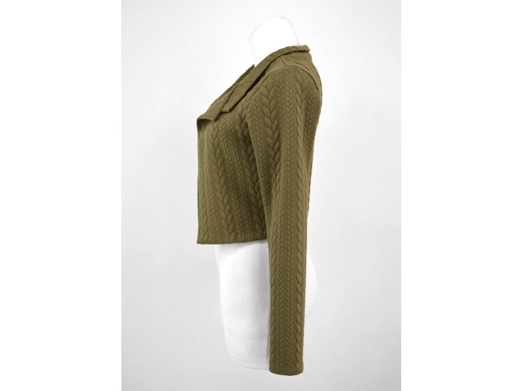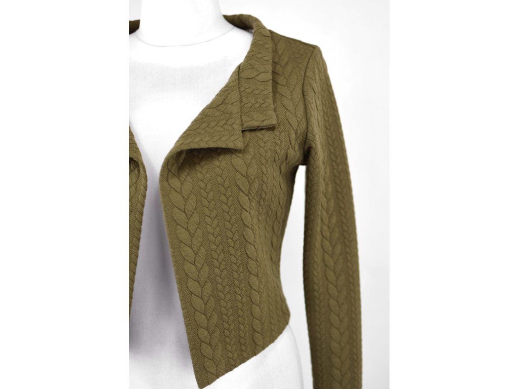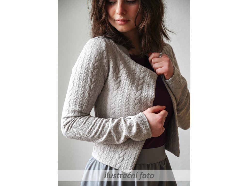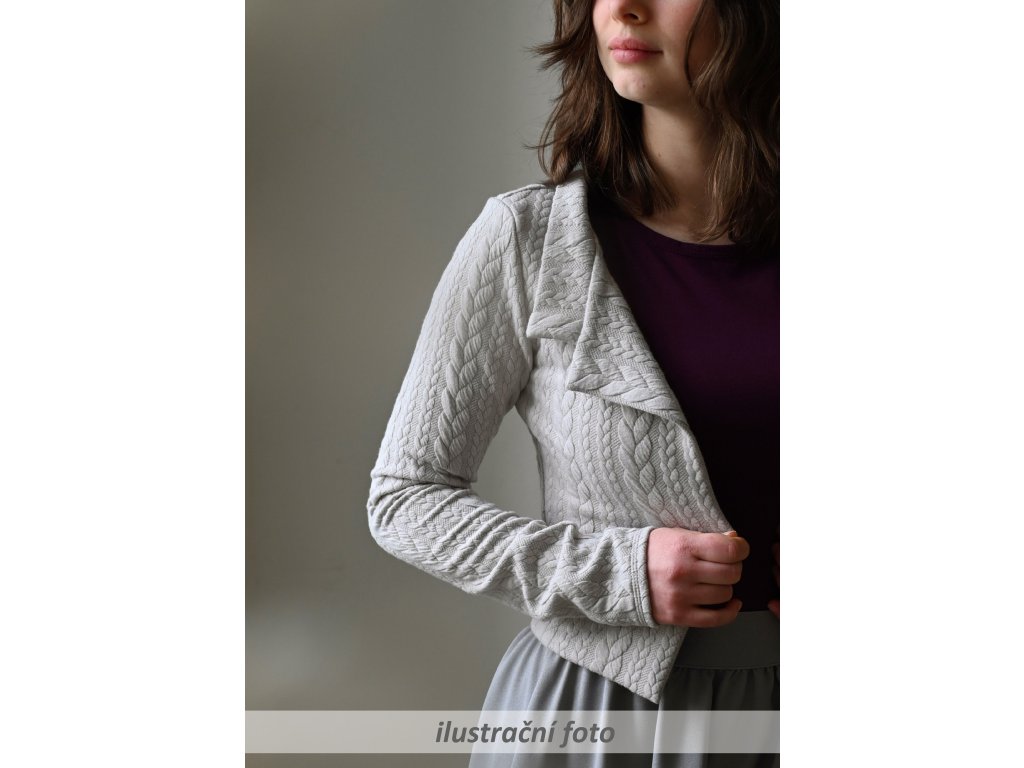Elegantní i volnočasové krátké sáčko otevřeného střihu bez zapínání, s dlouhými rukávy. Zadní díl je lehce prodloužený tvarovaný do oblouku. Vhodné ke kolovým a pasovým sukním. Dobře se kombinuje i s dalšími druhy oblečení, třeba se společenskými šaty. Ozdobná etiketa našitá na zadním boku nesmí přijít do sušičky.