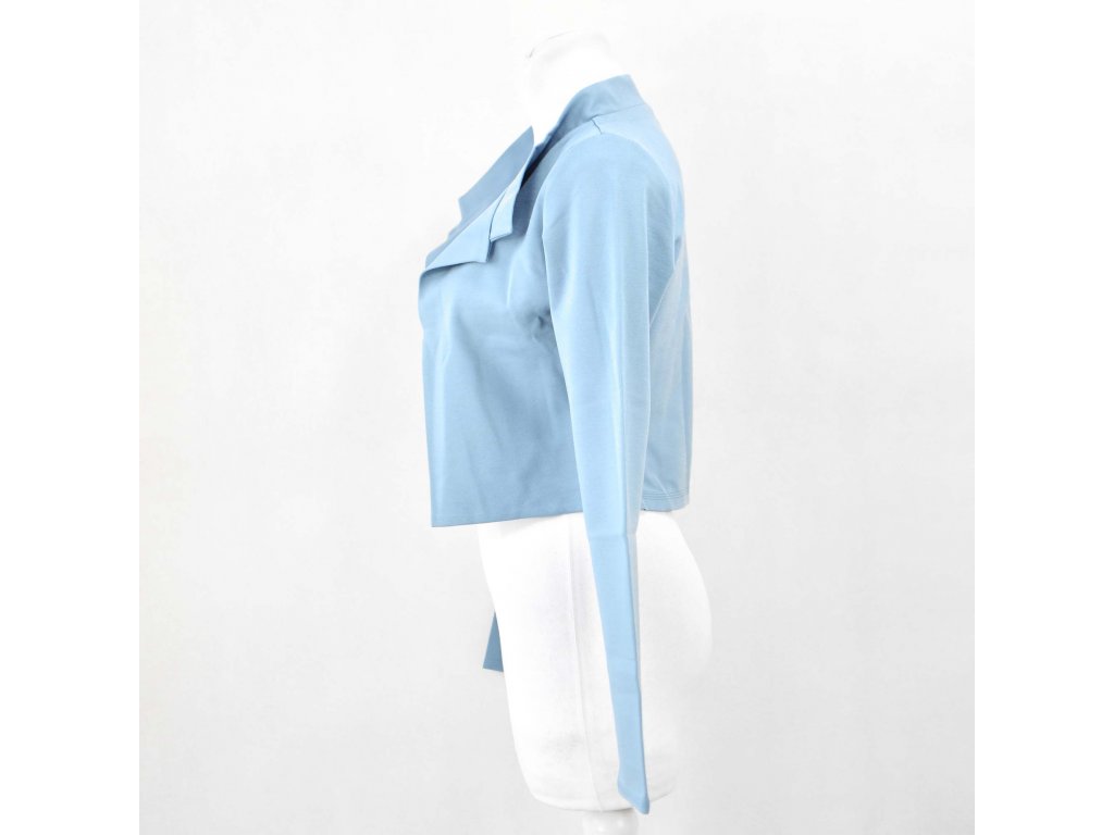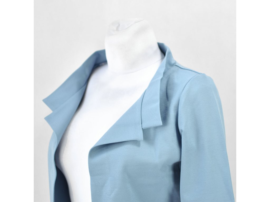 Elegantní i volnočasové krátké sáčko otevřeného střihu bez zapínání, s dlouhými rukávy. Zadní díl je lehce prodloužený tvarovaný do oblouku. Vhodné ke kolovým a pasovým sukním. Dobře se kombinuje i s dalšími druhy oblečení, třeba se společenskými šaty. Ozdobná etiketa našitá na zadním boku nesmí přijít do sušičky.