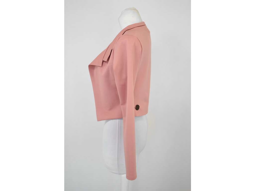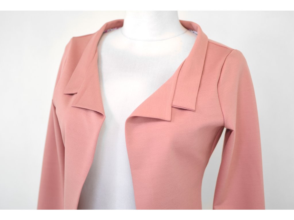Elegantní i volnočasové krátké sáčko otevřeného střihu bez zapínání, s dlouhými rukávy. Zadní díl je lehce prodloužený tvarovaný do oblouku. Vhodné ke kolovým a pasovým sukním. Dobře se kombinuje i s dalšími druhy oblečení, třeba se společenskými šaty. Ozdobná etiketa našitá na zadním boku nesmí přijít do sušičky.