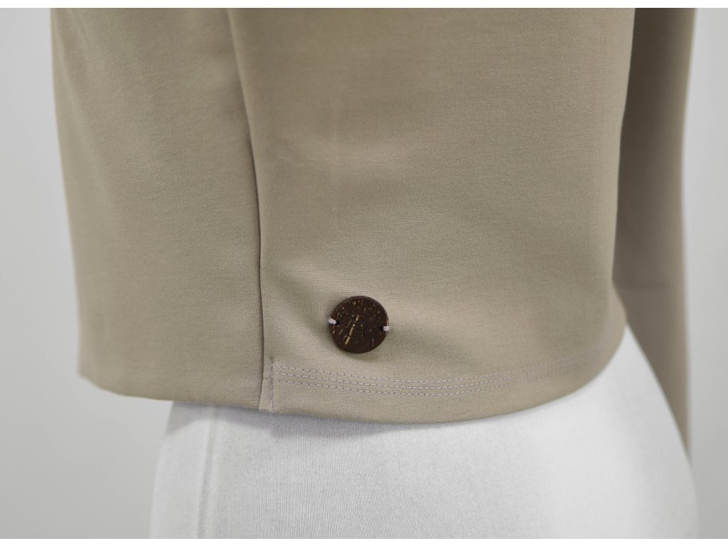 Elegantní i volnočasové krátké sáčko otevřeného střihu bez zapínání, s dlouhými rukávy. Zadní díl je lehce prodloužený tvarovaný do oblouku. Vhodné ke kolovým a pasovým sukním. Dobře se kombinuje i s dalšími druhy oblečení, třeba se společenskými šaty. Ozdobná etiketa našitá na zadním boku nesmí přijít do sušičky.