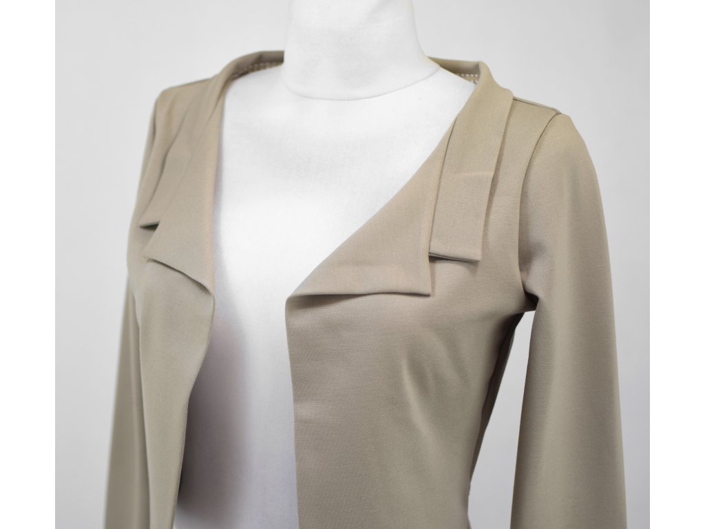 Elegantní i volnočasové krátké sáčko otevřeného střihu bez zapínání, s dlouhými rukávy. Zadní díl je lehce prodloužený tvarovaný do oblouku. Vhodné ke kolovým a pasovým sukním. Dobře se kombinuje i s dalšími druhy oblečení, třeba se společenskými šaty. Ozdobná etiketa našitá na zadním boku nesmí přijít do sušičky.