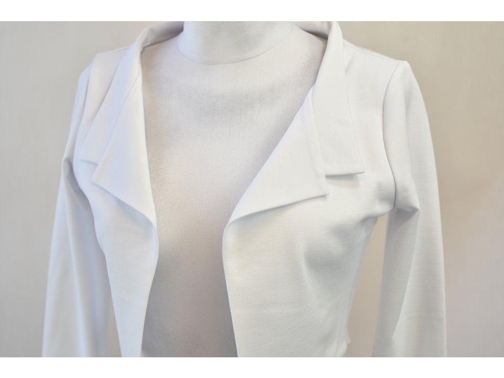 Elegantní i volnočasové krátké sáčko otevřeného střihu bez zapínání, s dlouhými rukávy. Zadní díl je lehce prodloužený tvarovaný do oblouku. Vhodné ke kolovým a pasovým sukním. Dobře se kombinuje i s dalšími druhy oblečení, třeba se společenskými šaty. Ozdobná etiketa našitá na zadním boku nesmí přijít do sušičky.