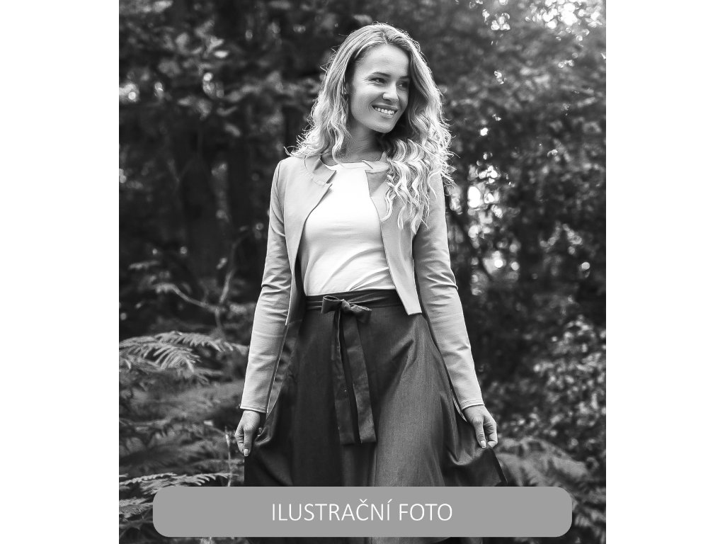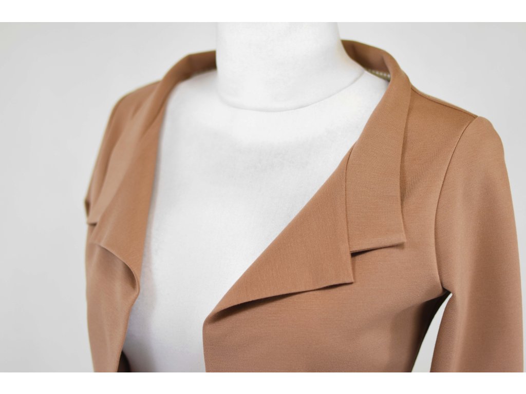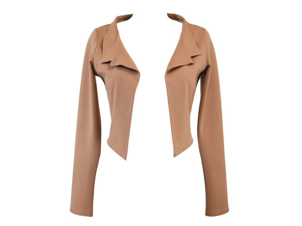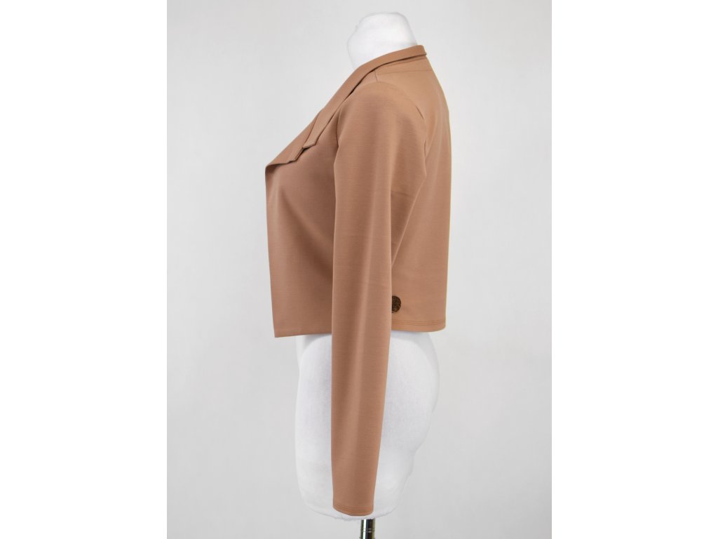 Elegantní i volnočasové krátké sáčko otevřeného střihu bez zapínání, s dlouhými rukávy. Zadní díl je lehce prodloužený tvarovaný do oblouku. Vhodné ke kolovým a pasovým sukním. Dobře se kombinuje i s dalšími druhy oblečení, třeba se společenskými šaty. Ozdobná etiketa našitá na zadním boku nesmí přijít do sušičky.