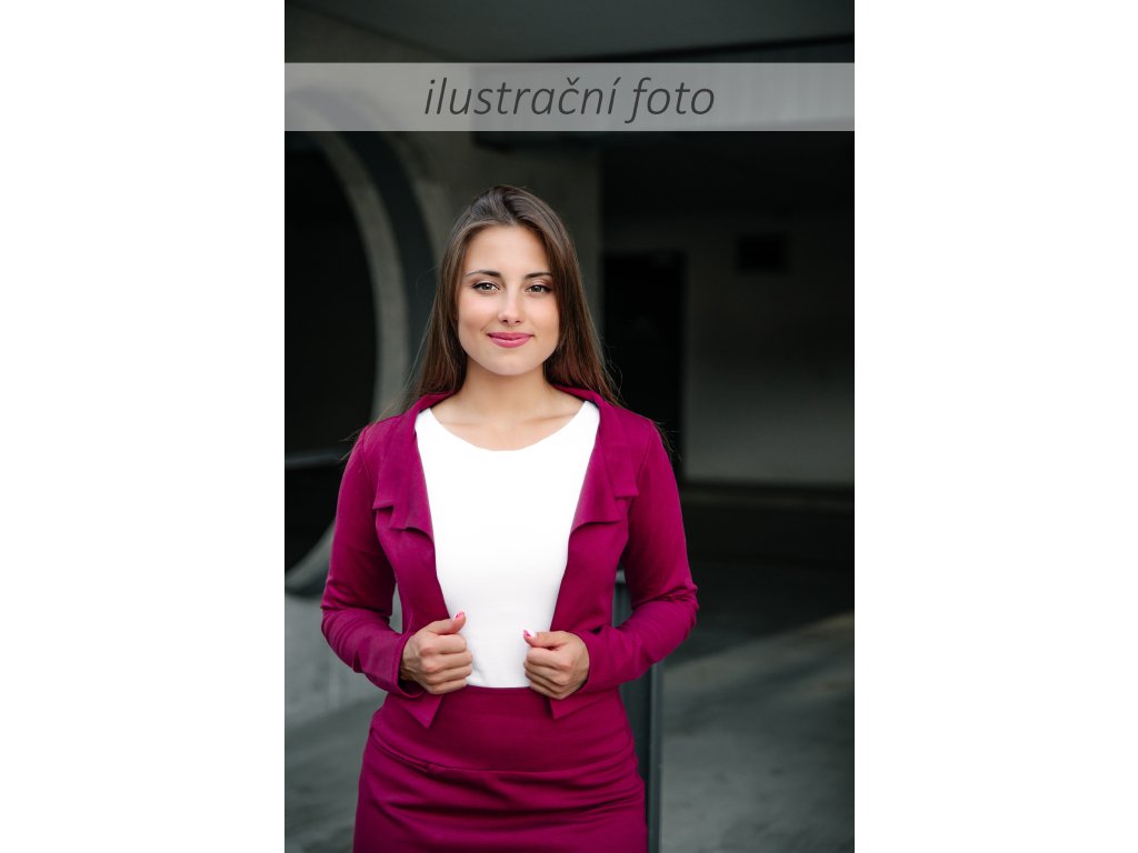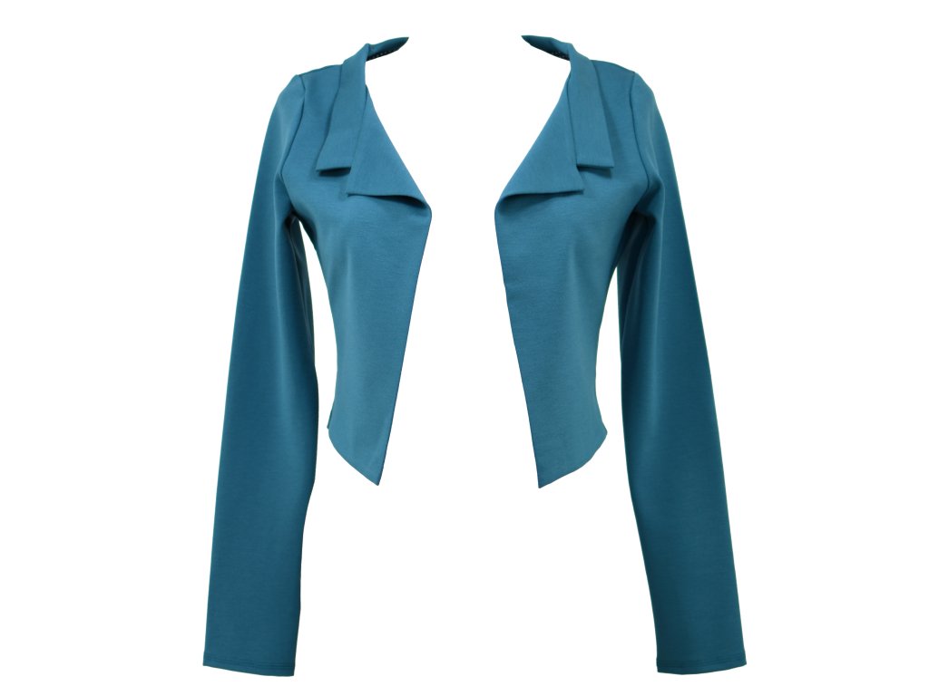 Elegantní i volnočasové krátké sáčko otevřeného střihu bez zapínání, s dlouhými rukávy. Zadní díl je lehce prodloužený tvarovaný do oblouku. Vhodné ke kolovým a pasovým sukním. Dobře se kombinuje i s dalšími druhy oblečení, třeba se společenskými šaty. Ozdobná etiketa našitá na zadním boku nesmí přijít do sušičky.