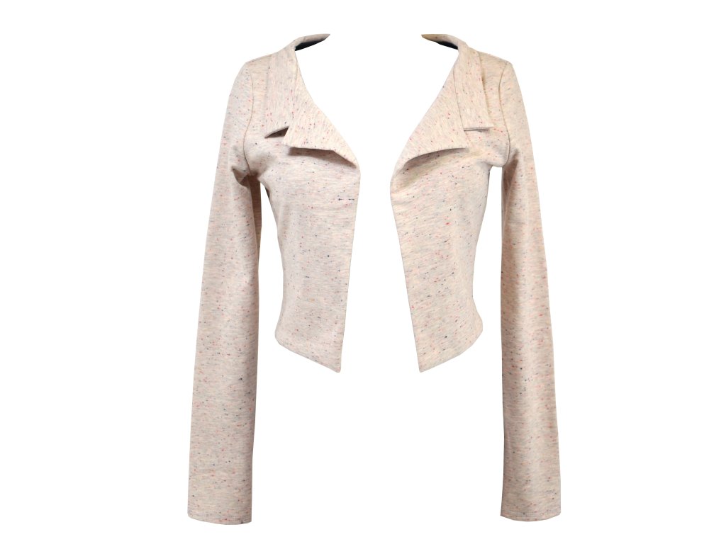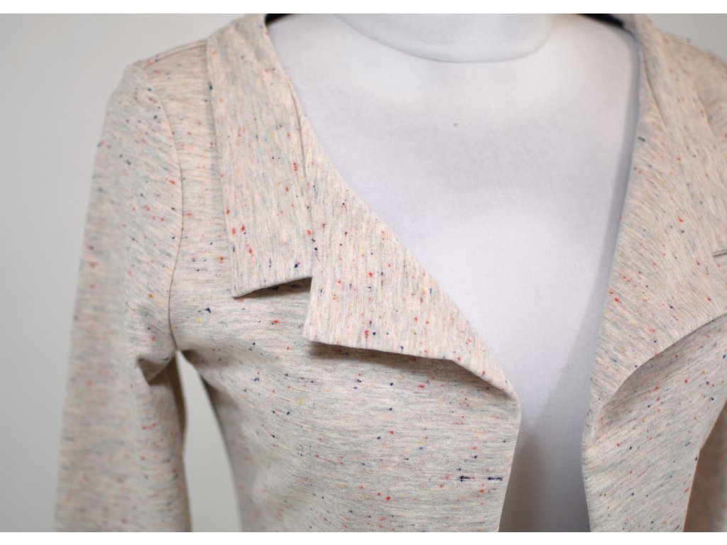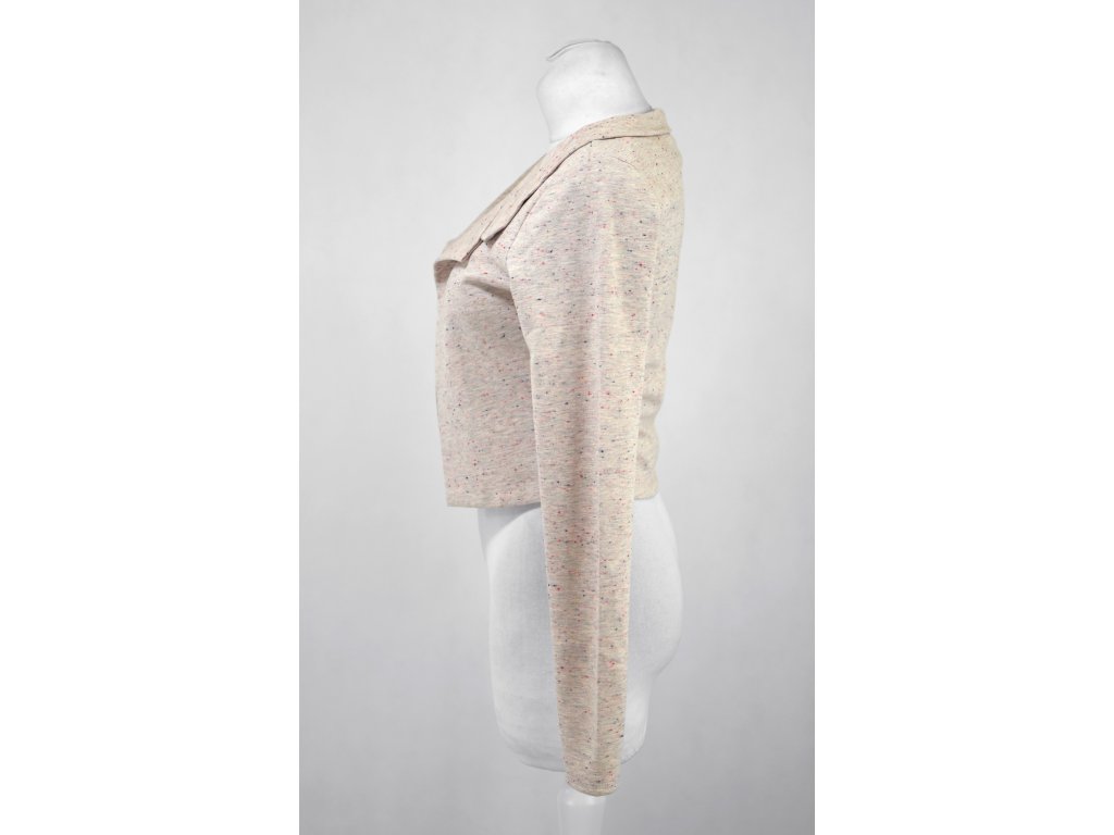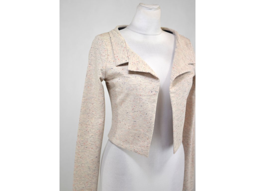 Elegantní i volnočasové krátké sáčko otevřeného střihu bez zapínání, s dlouhými rukávy. Zadní díl je lehce prodloužený tvarovaný do oblouku. Vhodné ke kolovým a pasovým sukním. Dobře se kombinuje i s dalšími druhy oblečení, třeba se společenskými šaty. Ozdobná etiketa našitá na zadním boku nesmí přijít do sušičky.
