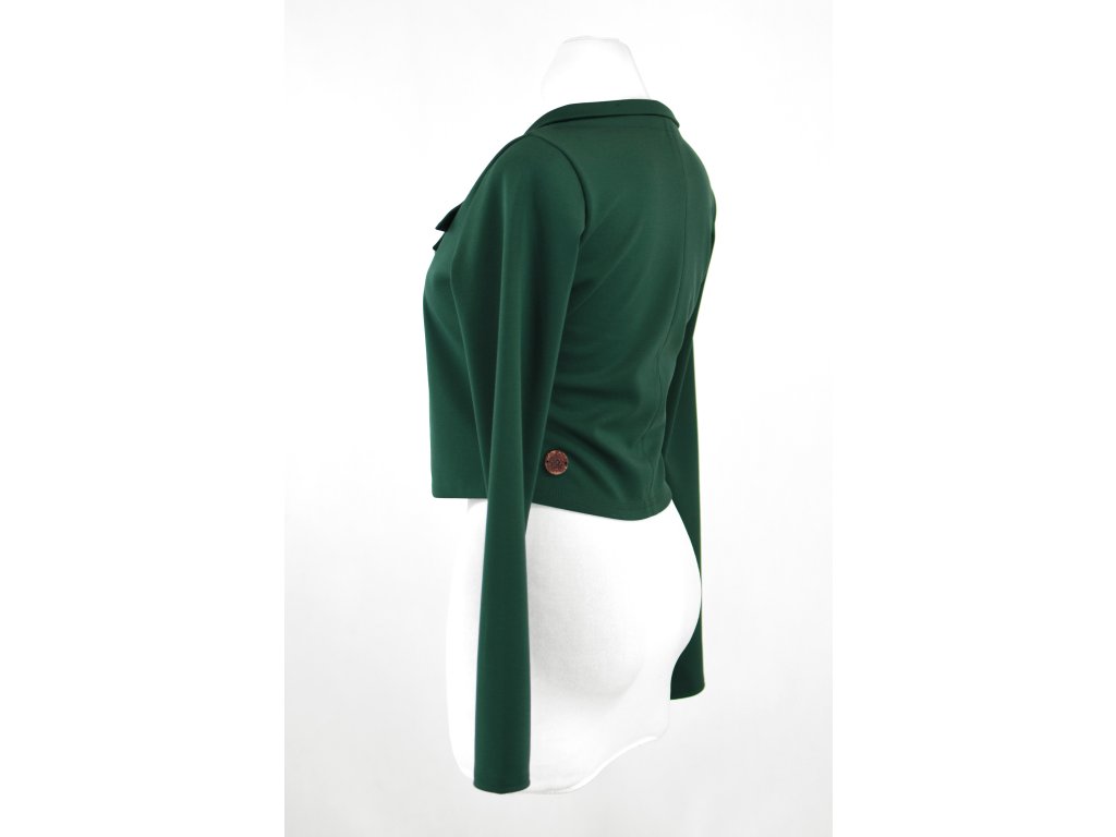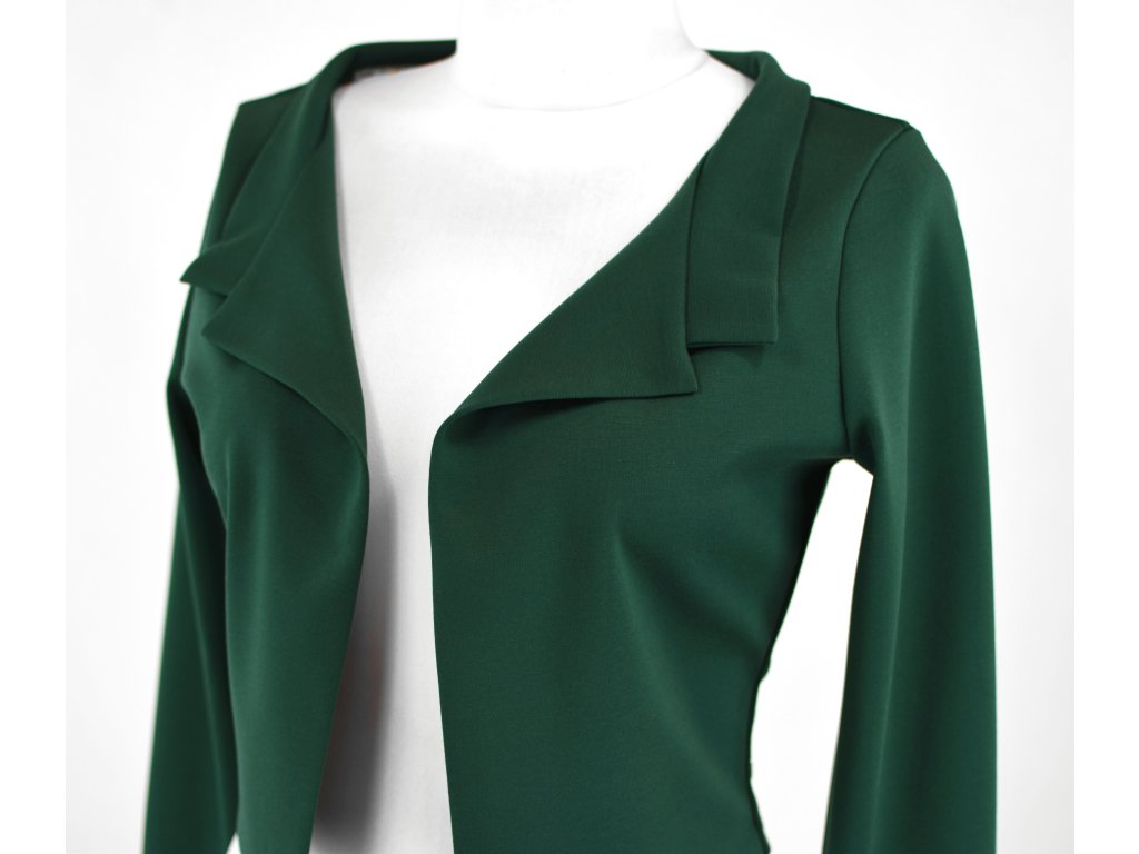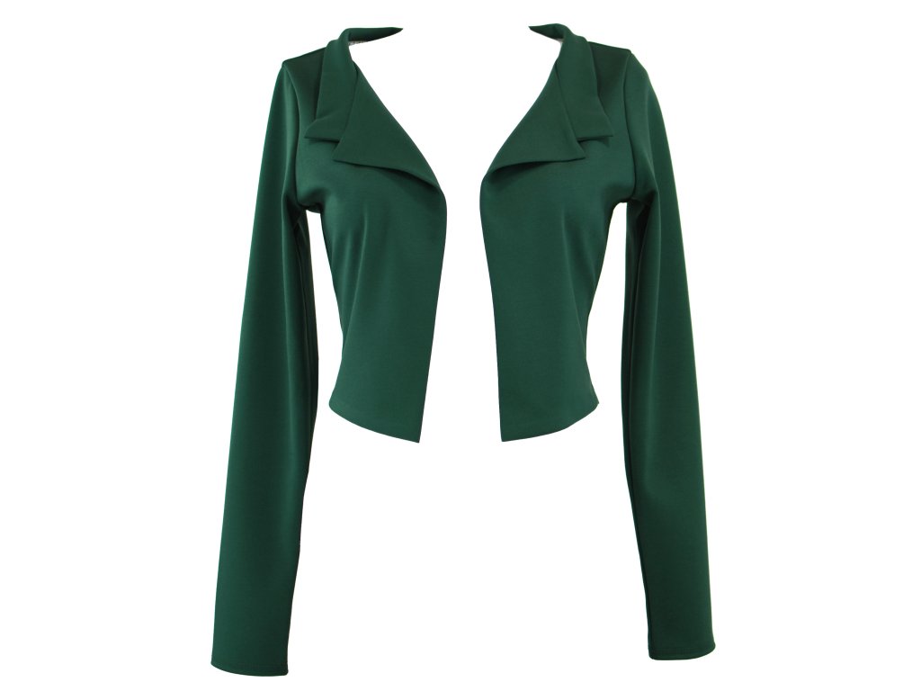Elegantní i volnočasové krátké sáčko otevřeného střihu bez zapínání, s dlouhými rukávy. Zadní díl je lehce prodloužený tvarovaný do oblouku. Vhodné ke kolovým a pasovým sukním. Dobře se kombinuje i s dalšími druhy oblečení, třeba se společenskými šaty. Ozdobná etiketa našitá na zadním boku nesmí přijít do sušičky.