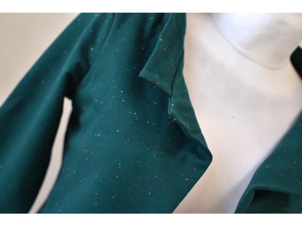 Elegantní i volnočasové krátké sáčko otevřeného střihu bez zapínání, s dlouhými rukávy. Zadní díl je lehce prodloužený tvarovaný do oblouku. Vhodné ke kolovým a pasovým sukním. Dobře se kombinuje i s dalšími druhy oblečení, třeba se společenskými šaty. Ozdobná etiketa našitá na zadním boku nesmí přijít do sušičky.