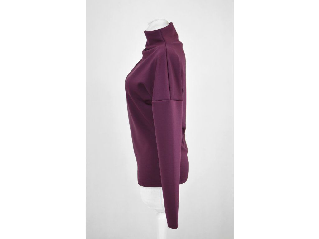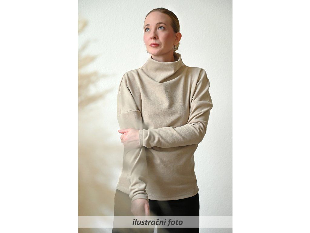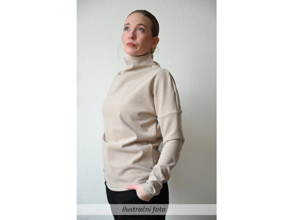 Dámská halenka s volnějším dvojitým stojáčkem, spadlými dlouhými rukávy a rovného střihu. Volnější přes hrudník. Působí volně a ležérně.