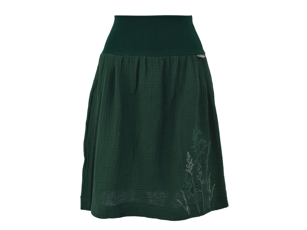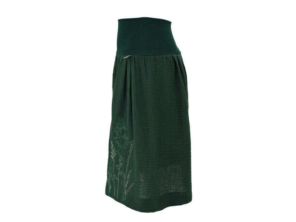 Dámská rovná sukně z mušelínu s dvojitým elastickým pasovým okrajem vhodným pro většinu velikostí. Z rubu elastického pasu je nechán otvor na případné vložení gumy na zpevnění či stažení pasu (vhodné pro velikost XS). Bez podšívky, bez kapes. Látka lehce prosvítá. S výšivkou travin.