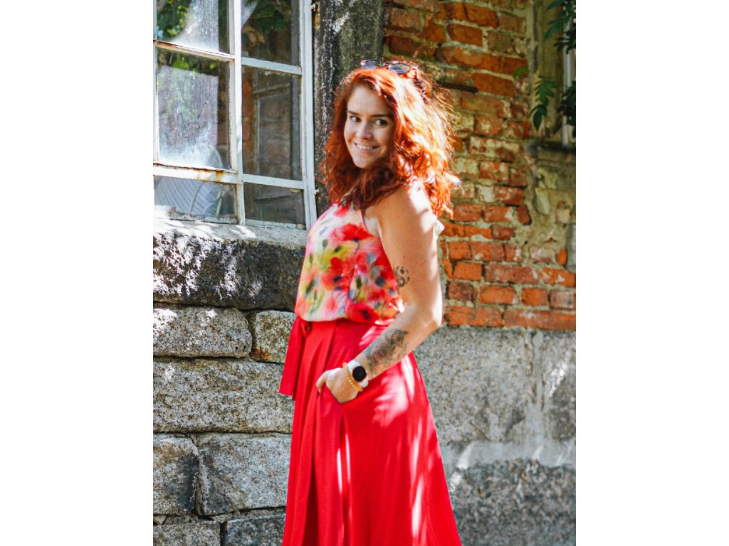 Dámské volné tílko/tunika. Ramínka jsou provlečena dokola a dají se stahovat a tím regulovat výstřih a průramky. V dolním okraji je taktéž šňůrka a tou se tílko podkasá - více či méně stáhne (v dolním okraji je dírka a gumička se dá případně vyndat). Je rovné v pase a volné přes bříško.