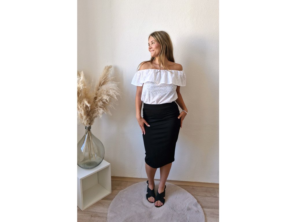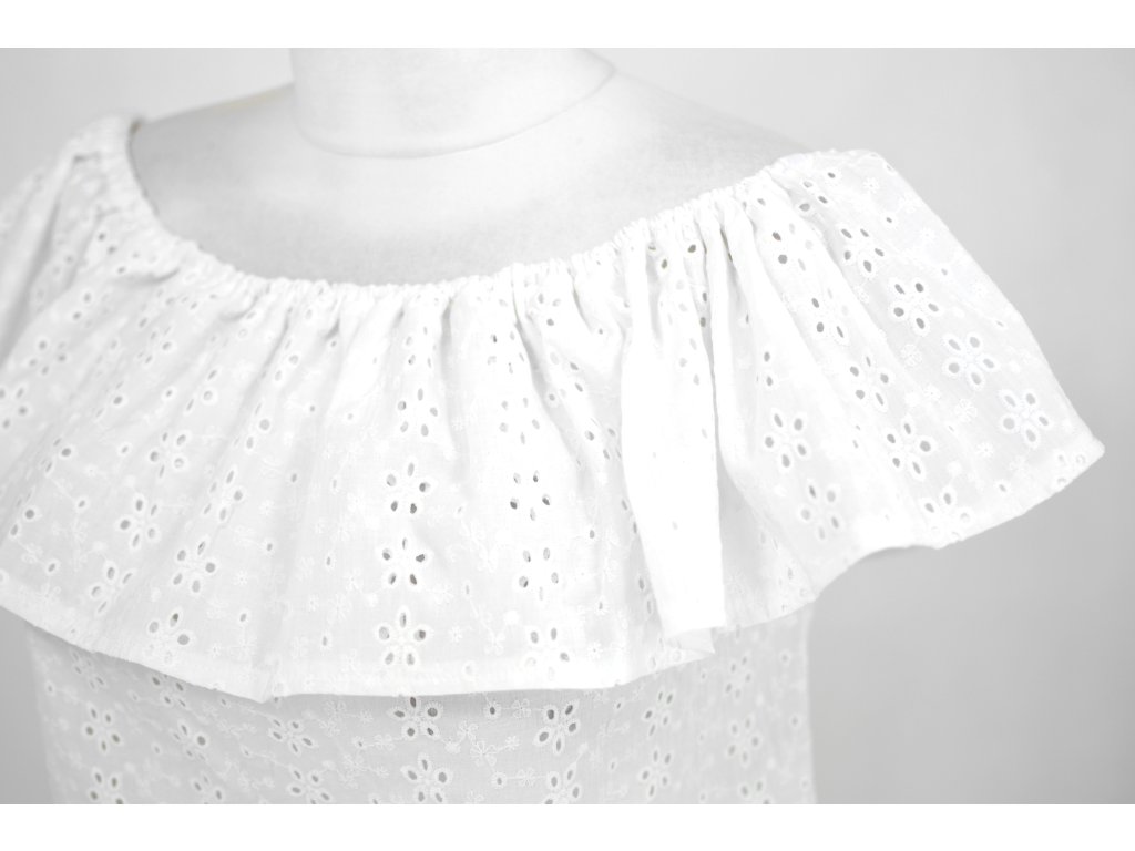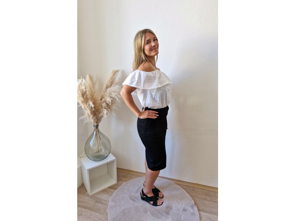 Dámský letní top s volánkem a odhalenými rameny. Volánek je na elastické gumičce kolem dokola. Top je rovného střihu, volnější a vzdušný. Ideální pro letní dny.
