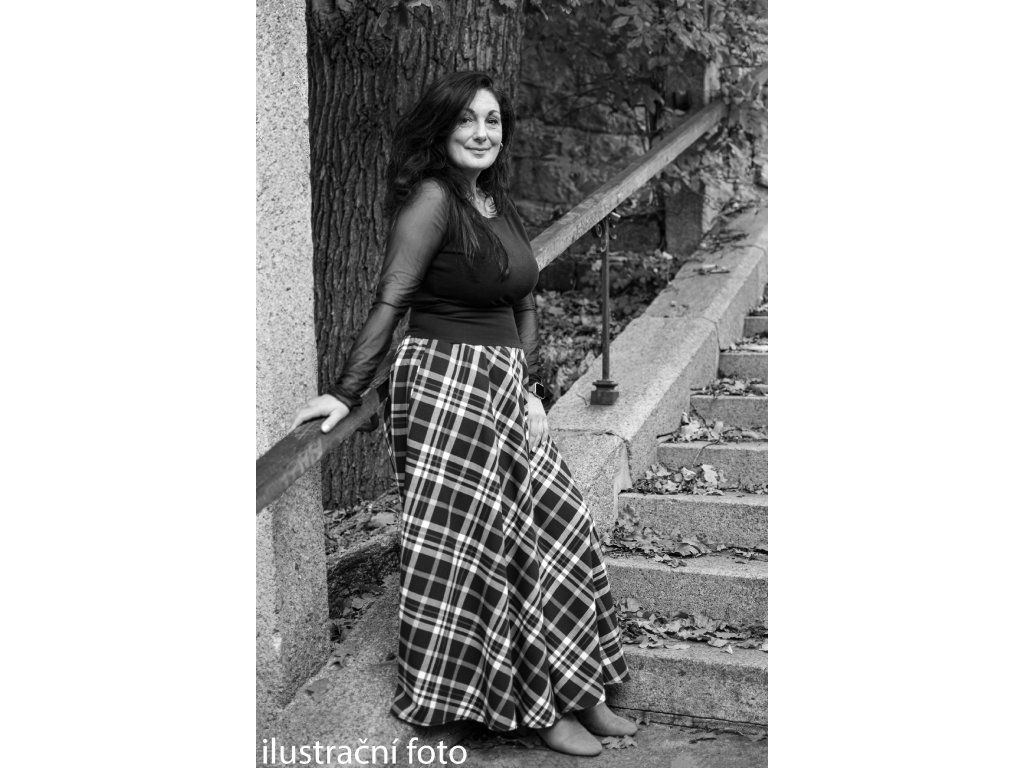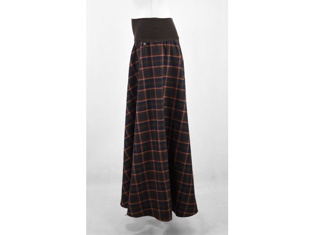Dlouhá dámská sukně půlkolového střihu s dvojitým elastickým pasovým okrajem vhodným pro většinu velikostí. Z rubu elastického pasu je nechán otvor na případné vložení gumy na zpevnění či stažení pasu (vhodné pro velikost XS).
