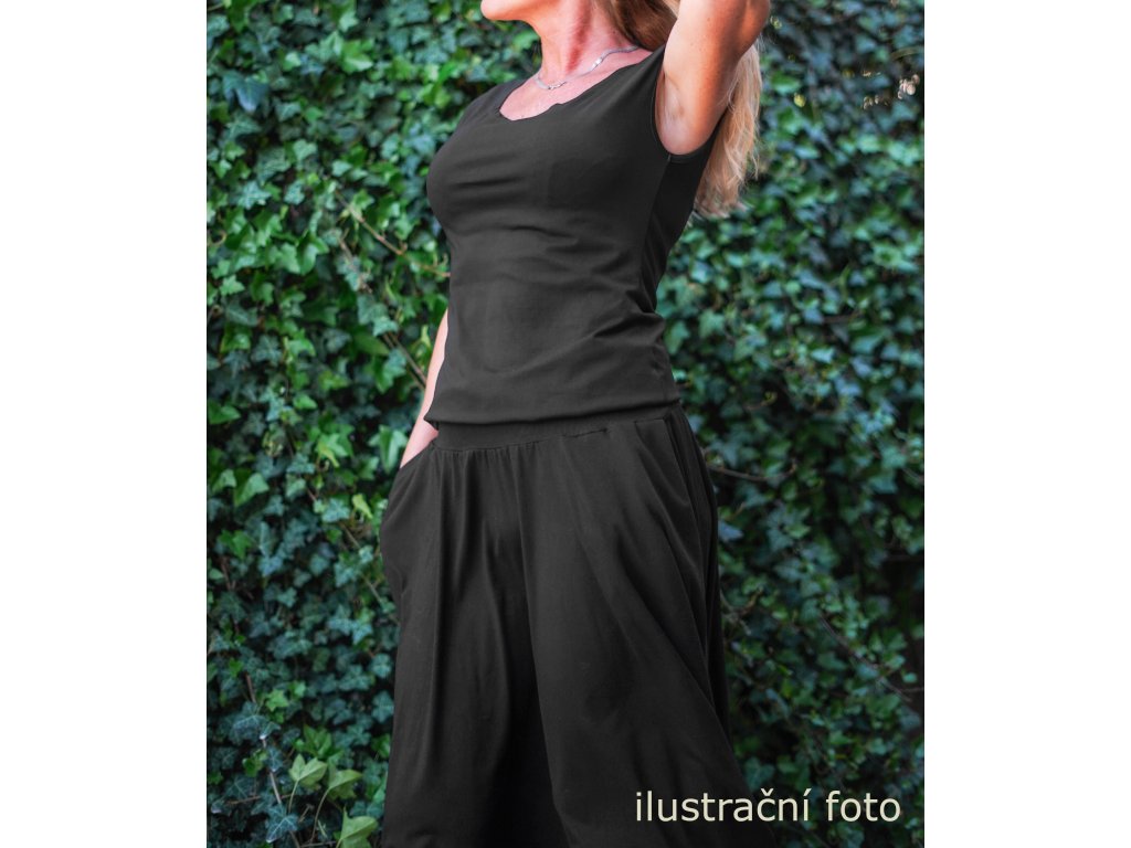 Vrchní díl vychází z našeho trička s kratšími rukávy s podkasáním - není tak obepnuté přes pas a bříško.
