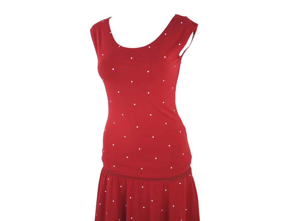 Vrchní díl vychází z našeho trička s kratšími rukávy s podkasáním - není tak obepnuté přes pas a bříško.
