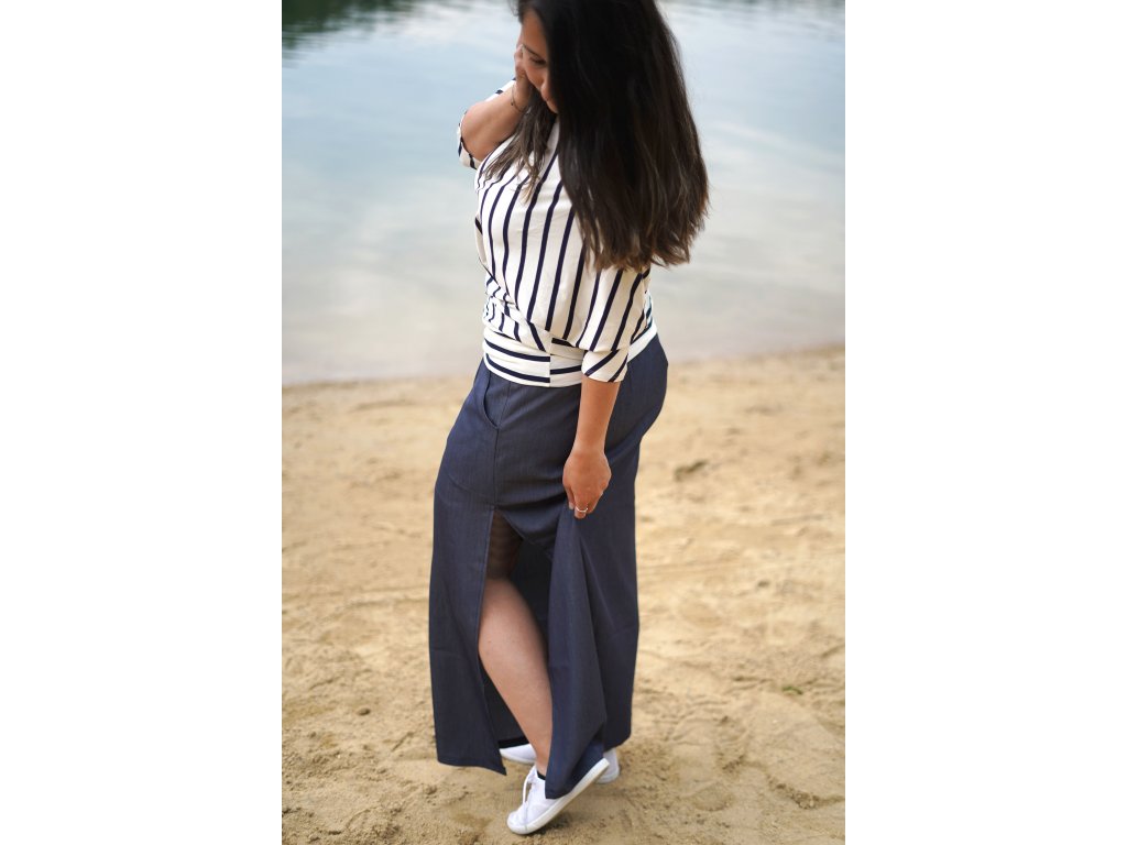 Maxi dlouhá sukně s dvojitým elastickým pasovým okrajem. Rovný střih, nenápadné kapsy v bocích, bez podšívky, na levé straně rozparek pro pohodlnější chůzi.