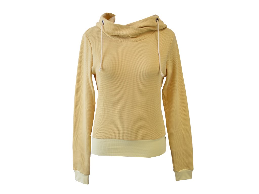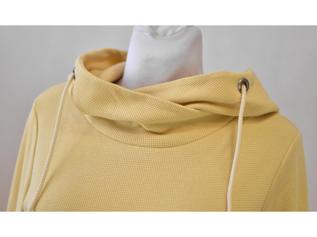 Má menší kapuci s překřížením u krku, dolní lem a rukávy jsou lemovány úpletem.