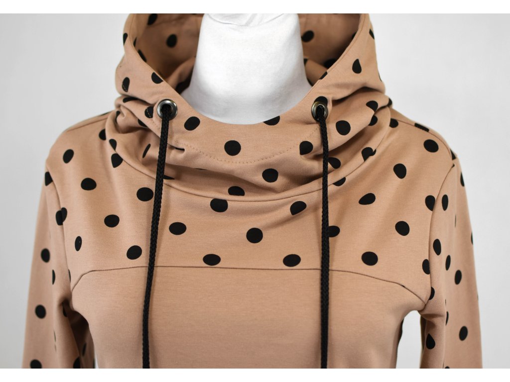 Dámská mikina s prodlouženými rukávy, rovnější v pase, s velkou kapucí a tkaničkou uvnitř na stažení. Rukávy, kapsy a dolní lem jsou ukončeny nápletem... :)
