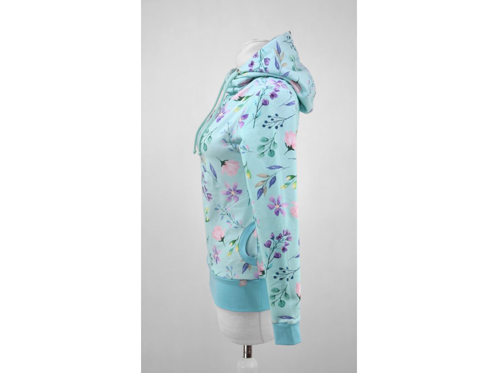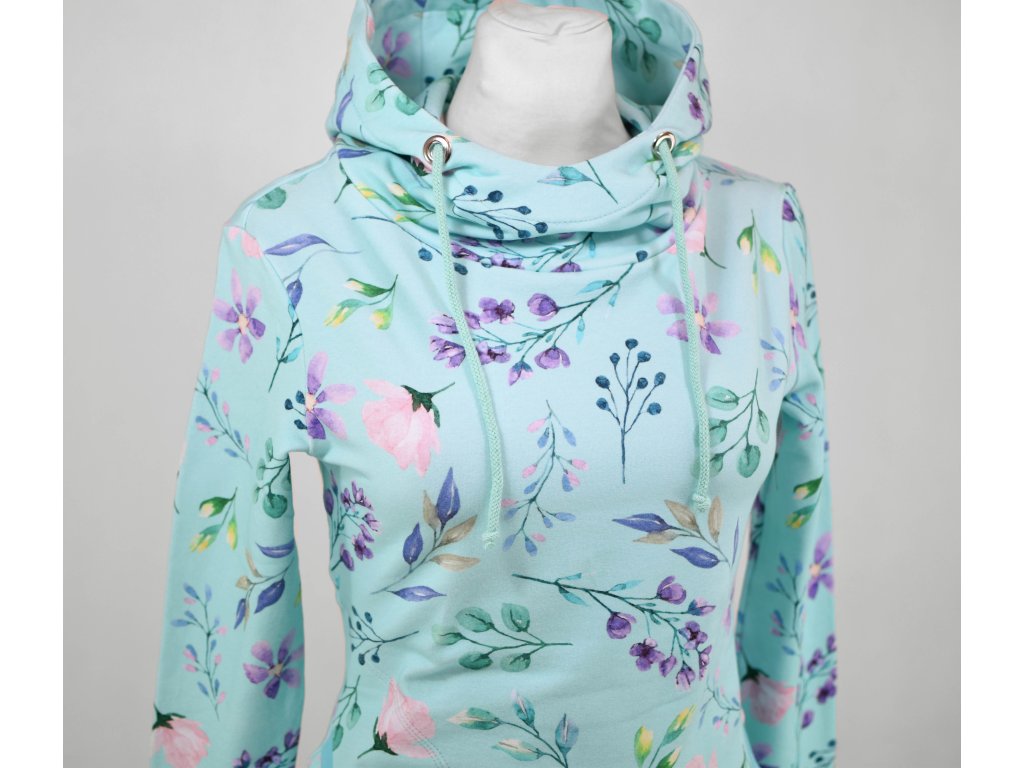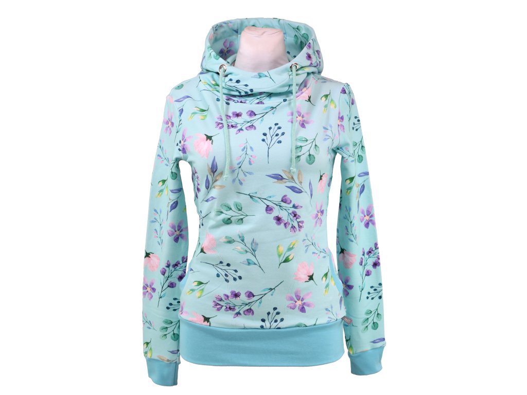Dámská mikina s prodlouženými rukávy, rovnější v pase, s velkou kapucí a tkaničkou uvnitř na stažení. Rukávy, kapsy a dolní lem jsou ukončeny nápletem...