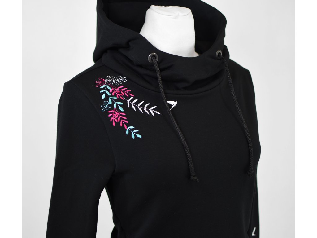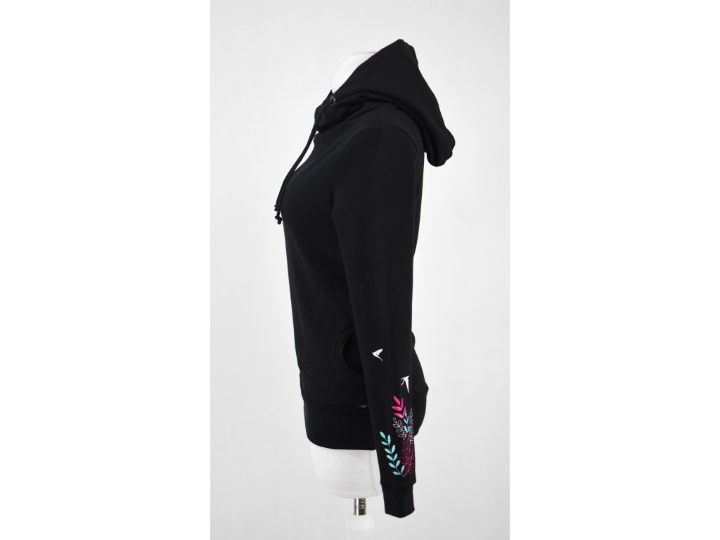 Dámská mikina s prodlouženými rukávy, rovnější v pase, s velkou kapucí a tkaničkou uvnitř na stažení. Rukávy, kapsy a dolní lem jsou ukončeny nápletem...