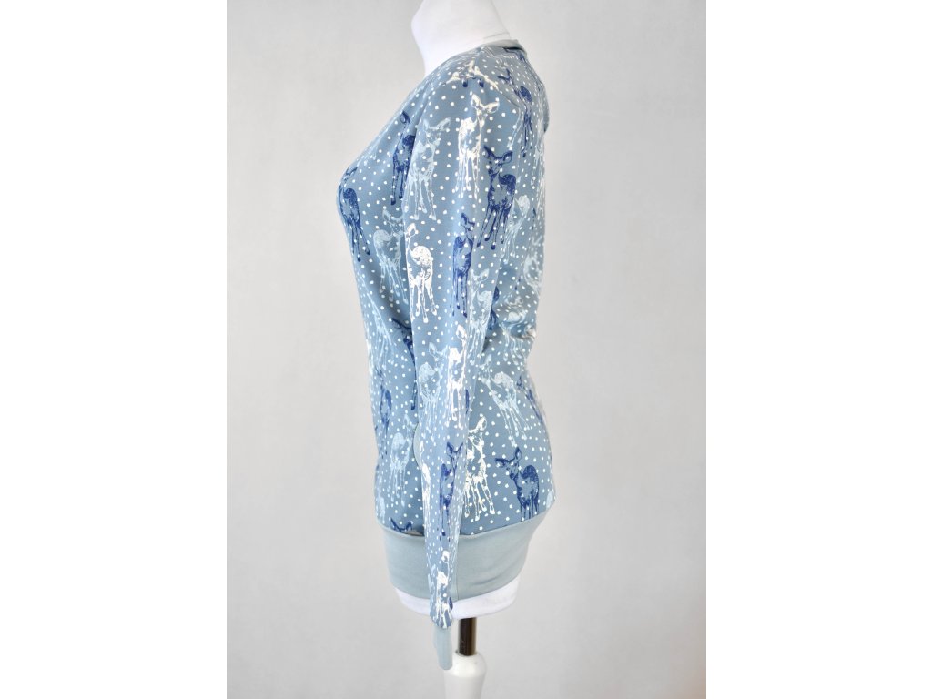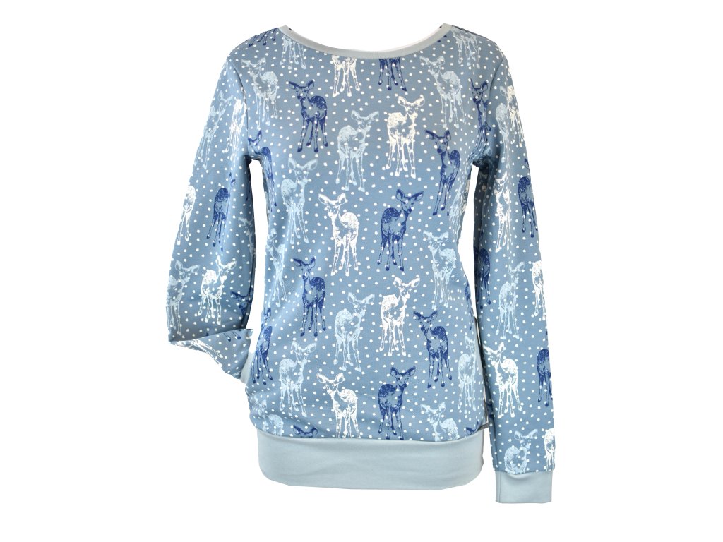 Dámská mikina prodloužené délky a s prodlouženými rukávy. Rovnější v pase, kapsy v bocích, průkrčník jsou lemované úpletem a taktéž rukávy.