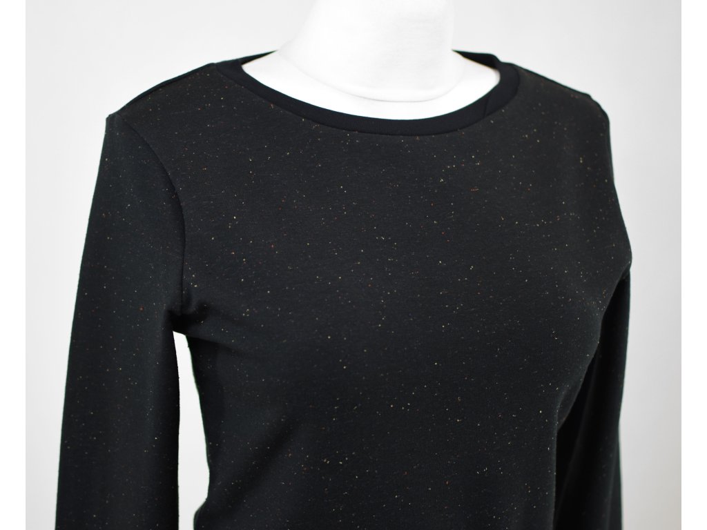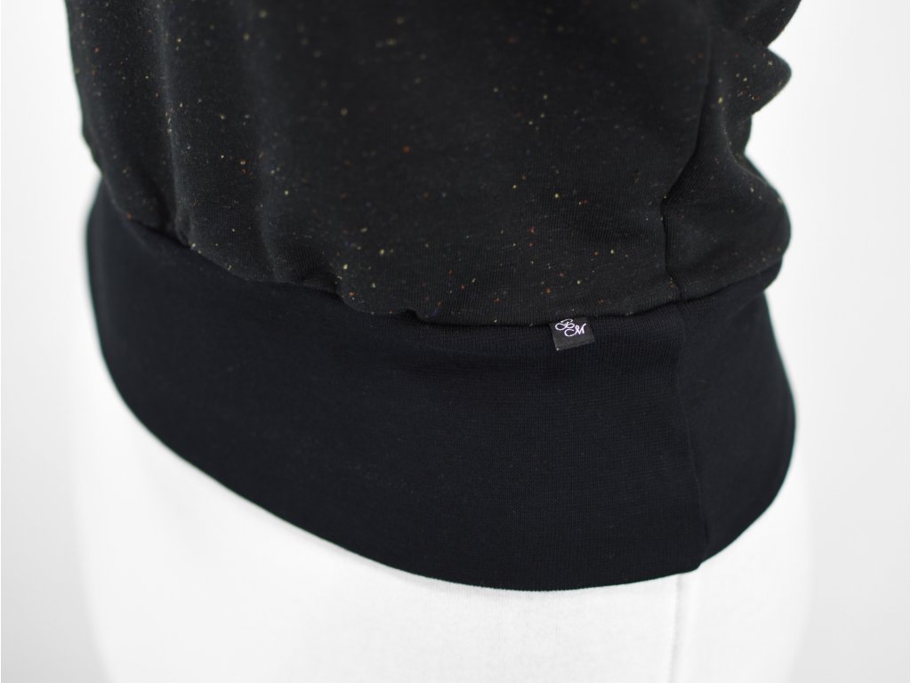 Dámská mikina zkrácené délky do pasu, vhodná ke kolovým, půlkolovým a pasovým sukním. Průkrčník, dolní lem a rukávy jsou lemovány úpletem.