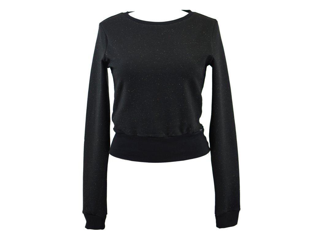 Dámská mikina zkrácené délky do pasu, vhodná ke kolovým, půlkolovým a pasovým sukním. Průkrčník, dolní lem a rukávy jsou lemovány úpletem.