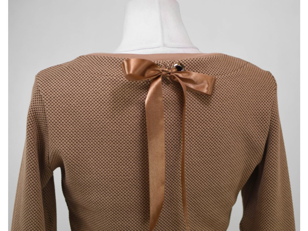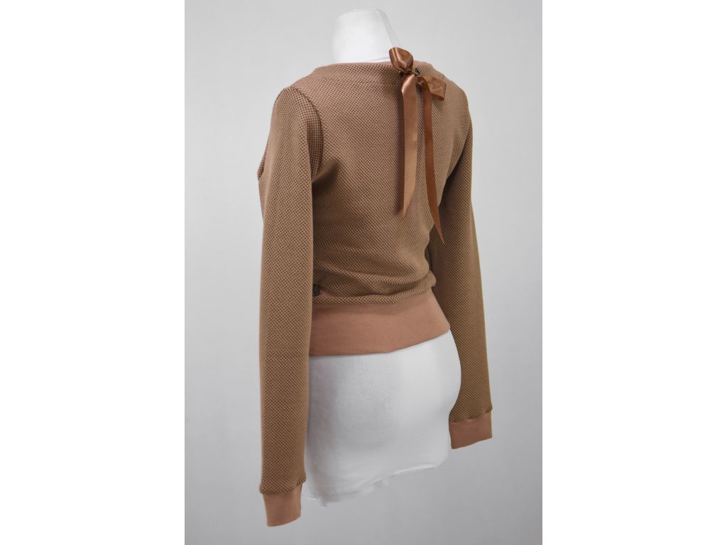 Dámská mikina zkrácené délky do pasu. Průkrčník, dolní lem a rukávy jsou lemovány úpletem. Na zádech jsou dva druky, kterými se dá provléknout stužka na ozdobu (dá se lehce vyndat či vyměnit). Druky jsou podšity látkou a nedotýkají se kůže.