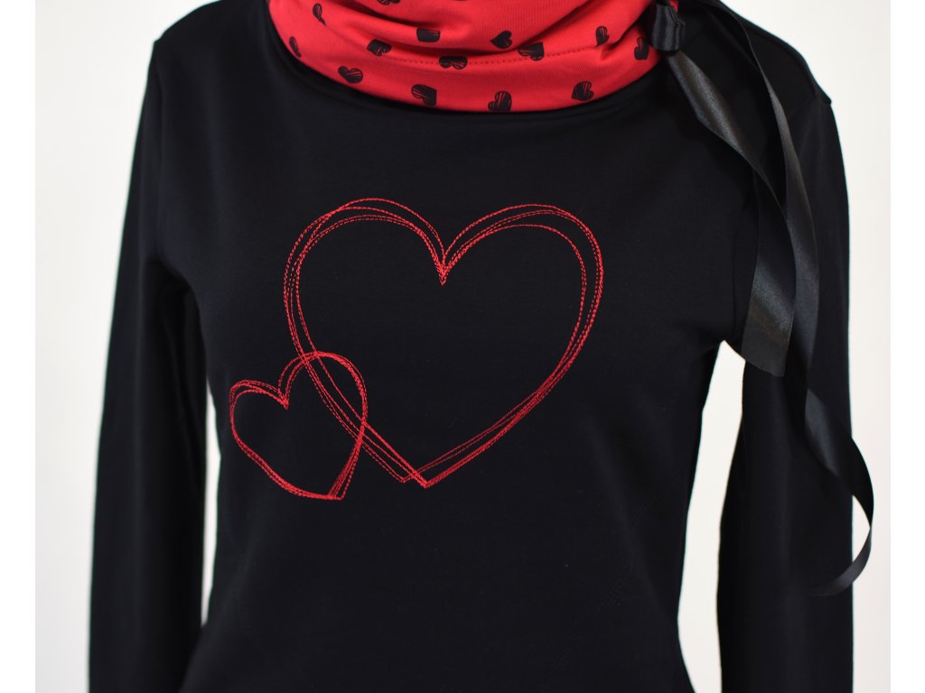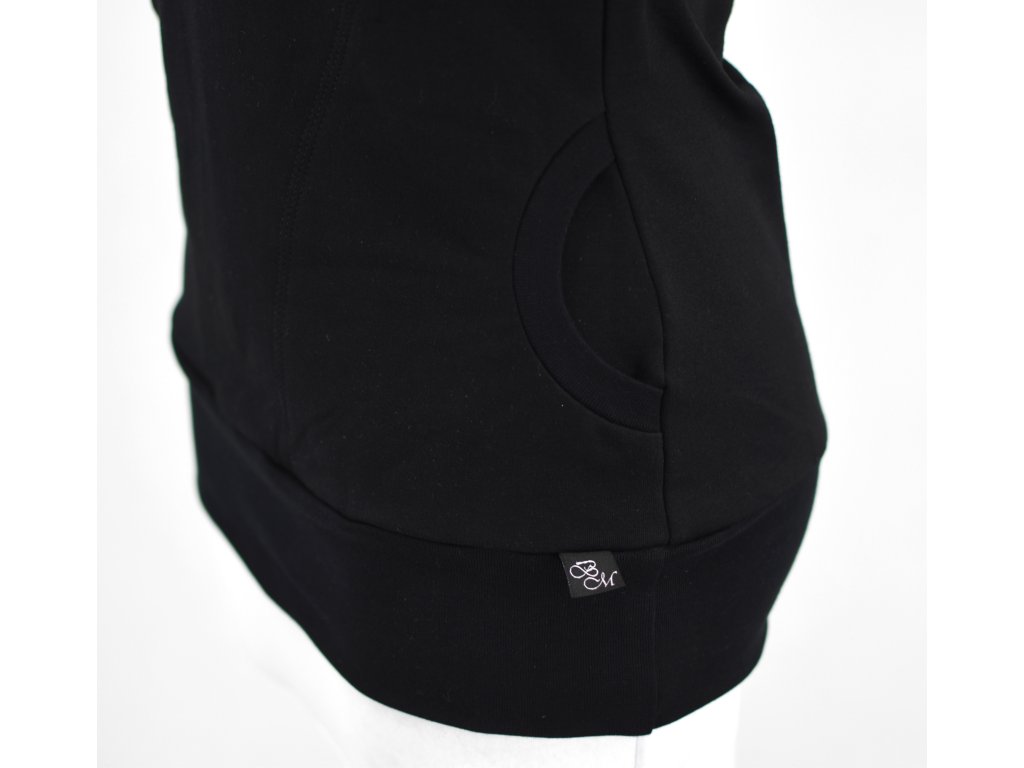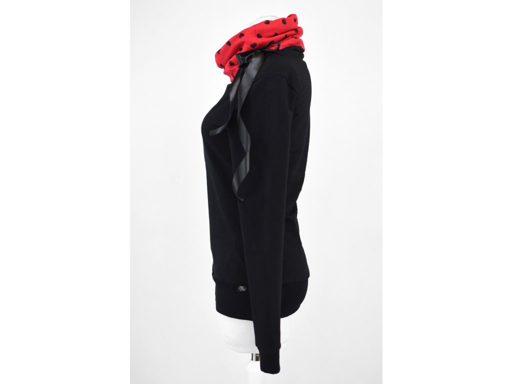 Dámská mikina prodloužené délky a s prodlouženými rukávy. Rovnější v pase, kapsy v bocích jsou lemované úpletem a taktéž rukávy. Obří límec má z rubu otvor a je jím protažena stuha, kterou ho můžete stáhnout. Lze ho nosit ohrnutý.