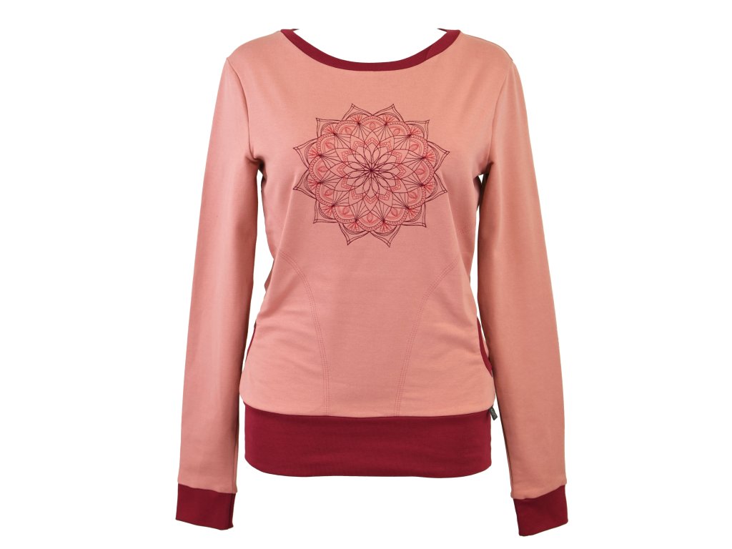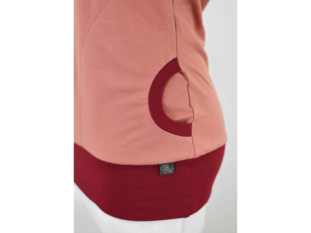 Dámská mikina prodloužené délky a s prodlouženými rukávy. Rovnější v pase, kapsy v bocích, průkrčník a rukávy jsou lemované úpletem. Zdobená výšivkou. Látka s certifikátem GOTS.