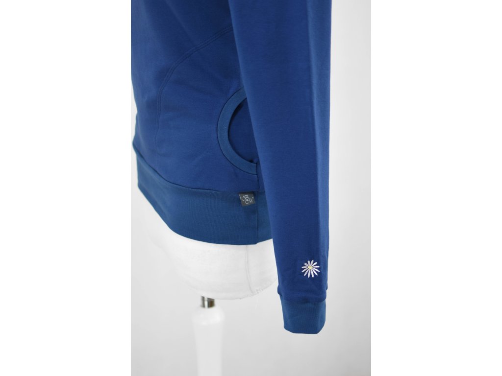Dámská mikina s prodlouženými rukávy, rovnější v pase, s velkou kapucí a tkaničkou uvnitř na stažení. Rukávy, kapsy a dolní lem jsou ukončeny nápletem...