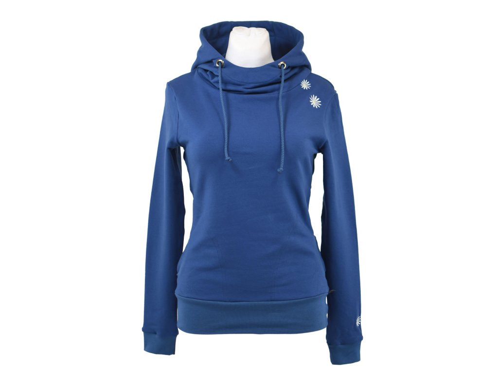 Dámská mikina s prodlouženými rukávy, rovnější v pase, s velkou kapucí a tkaničkou uvnitř na stažení. Rukávy, kapsy a dolní lem jsou ukončeny nápletem...