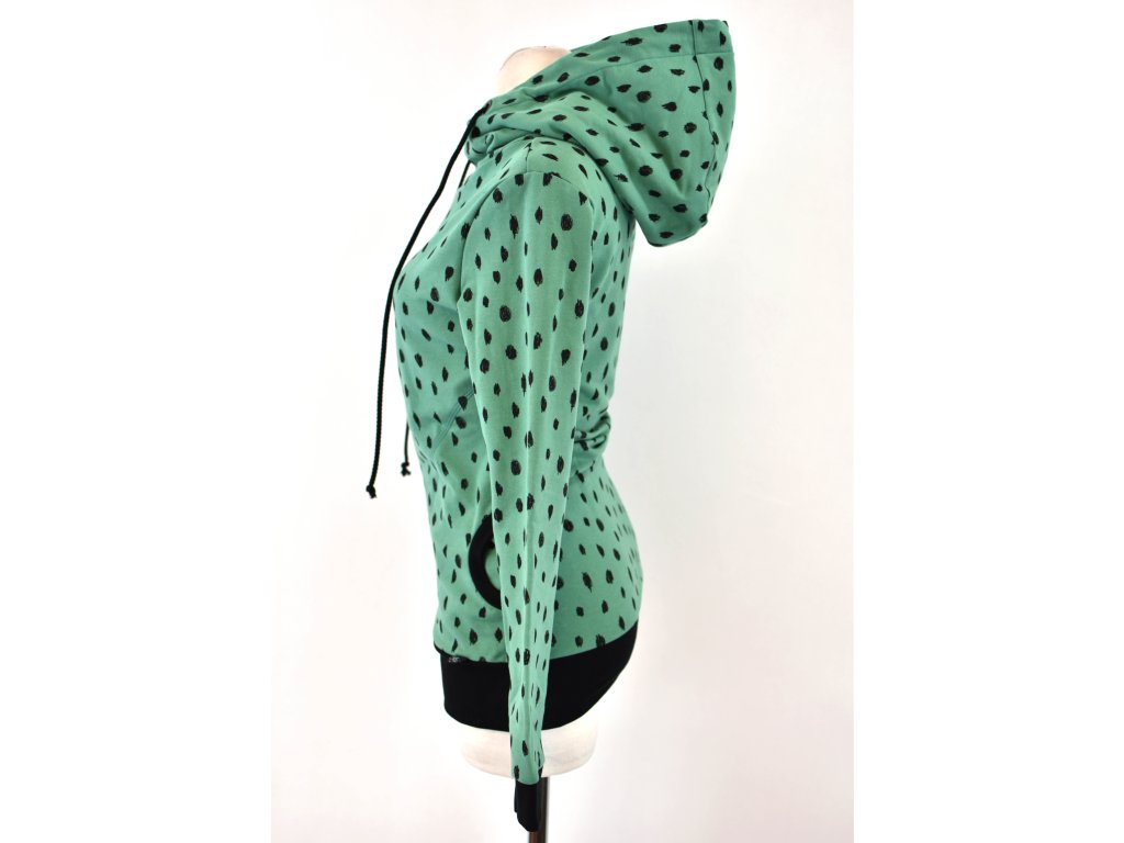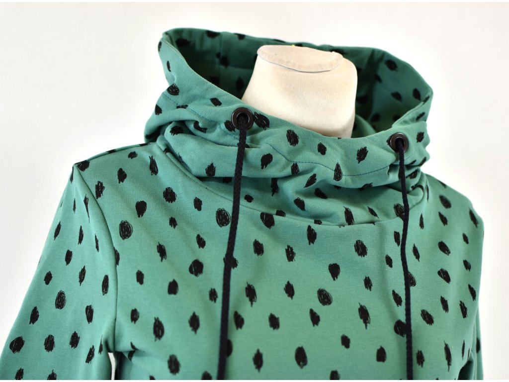 Dámská mikina s prodlouženými rukávy, rovnější v pase s obří kapucí a tkaničkou uvnitř na stažení. Kapsy a dolní lem jsou ukončeny nápletem... :)