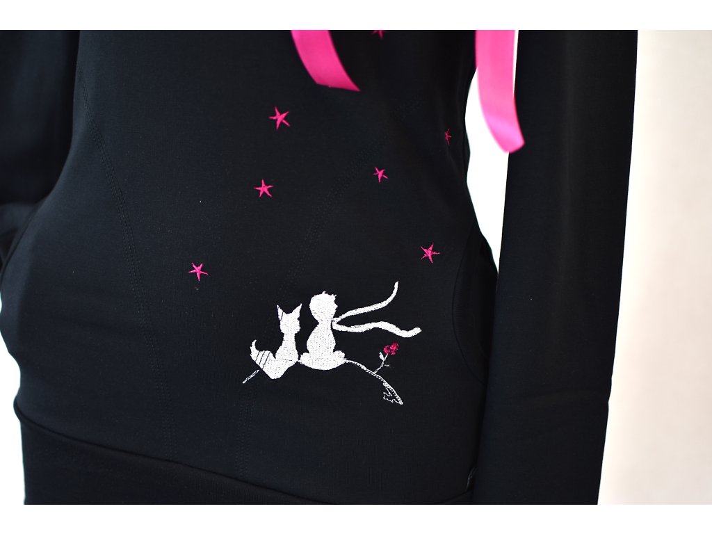 Dámská mikina prodloužené délky a s prodlouženými rukávy. Rovnější v pase, kapsy v bocích jsou lemované úpletem a taktéž rukávy. Obří límec má z rubu otvor a je jím protažena stuha, kterou ho můžete stáhnout. Lze ho nosit ohrnutý.