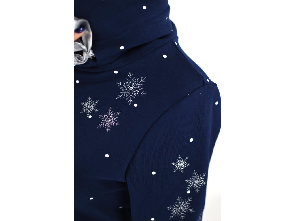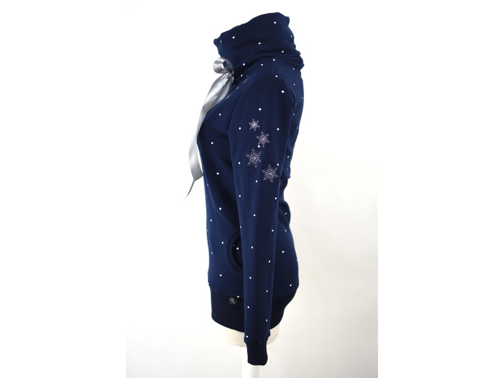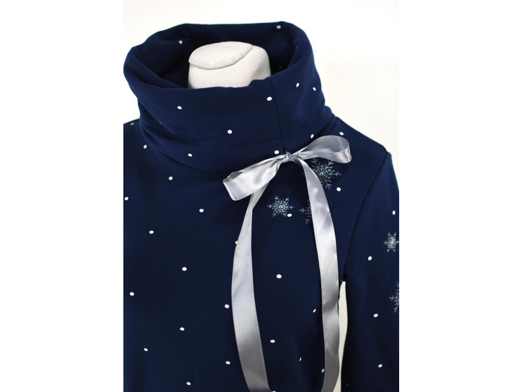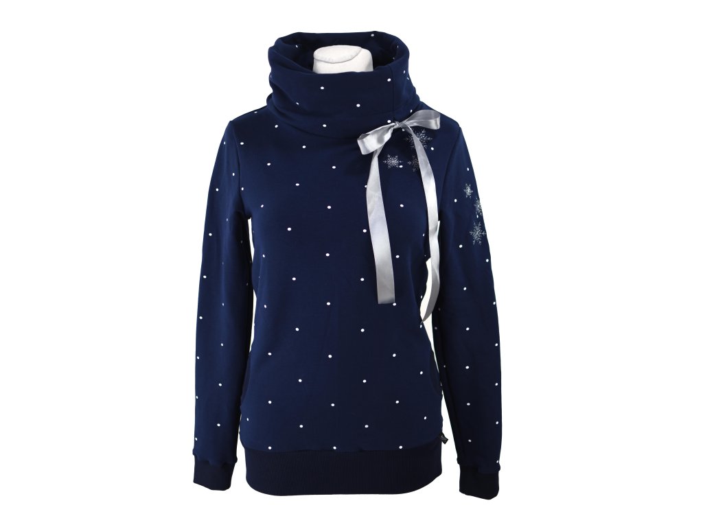 Dámská mikina prodloužené délky a s prodlouženými rukávy. Rovnější v pase, kapsy v bocích jsou lemované úpletem a taktéž rukávy. Obří límec má z rubu otvor a je jím protažena stuha, kterou ho můžete stáhnout. Lze ho nosit ohrnutý.