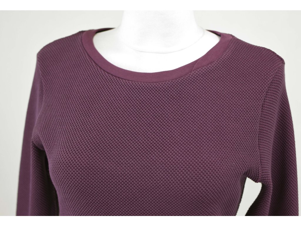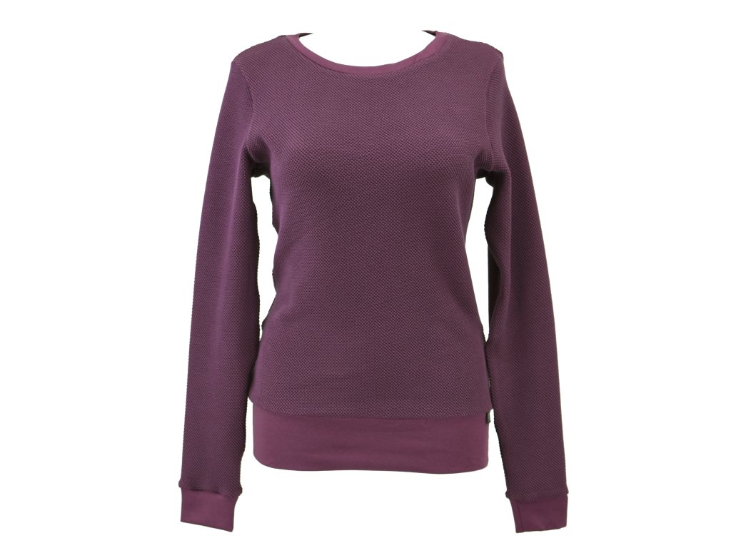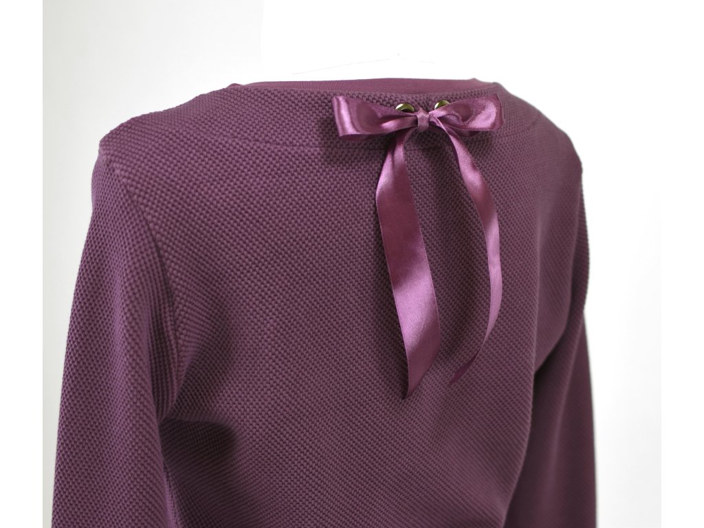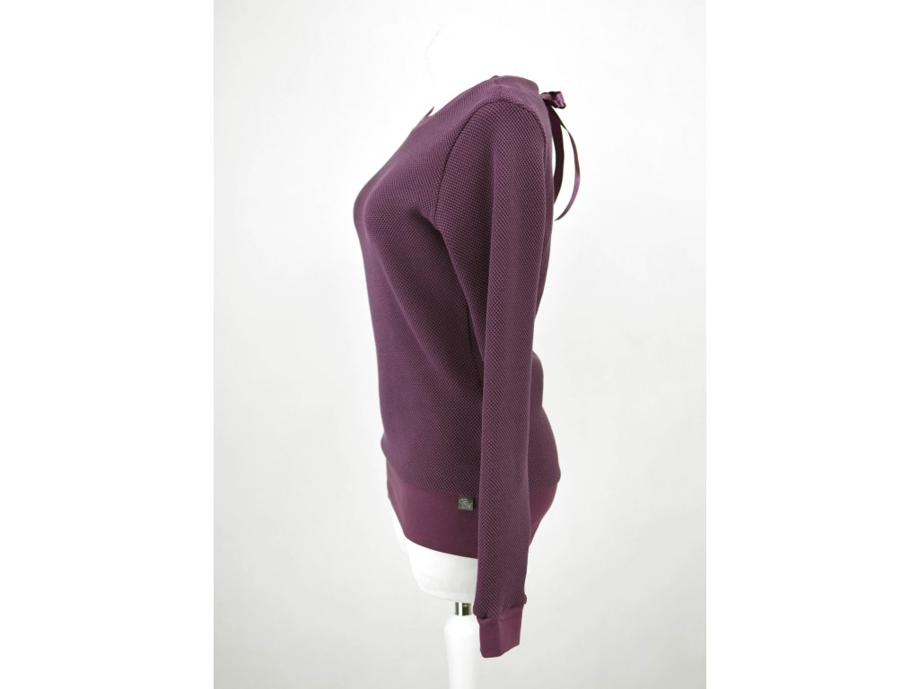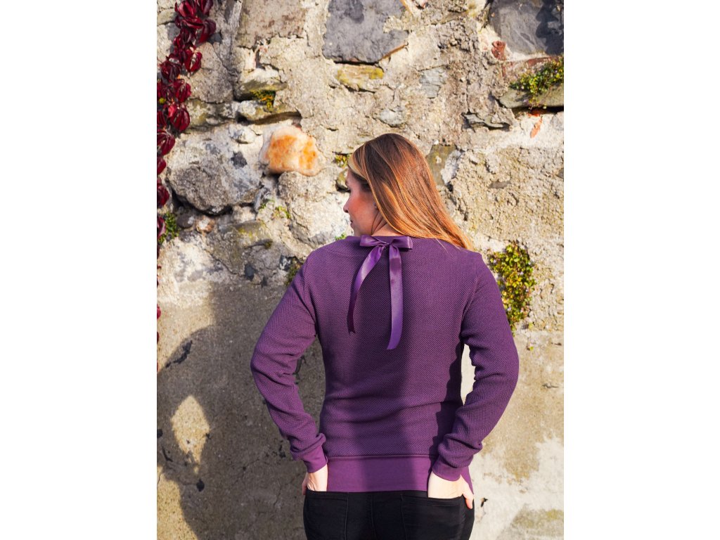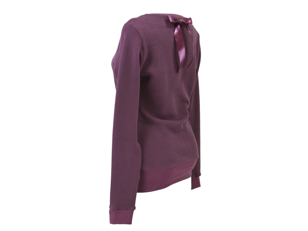Dámská mikina prodloužené délky a s prodlouženými rukávy. Rovnější v pase, průkrčník, dolní lem a rukávy jsou lemované úpletem. Na zádech jsou dva druky, kterými se dá provléknout stužka na ozdobu (dá se lehce vyndat či vyměnit). Druky jsou podšity látkou a nedotýkají se kůže... :) Nemá kapsy.