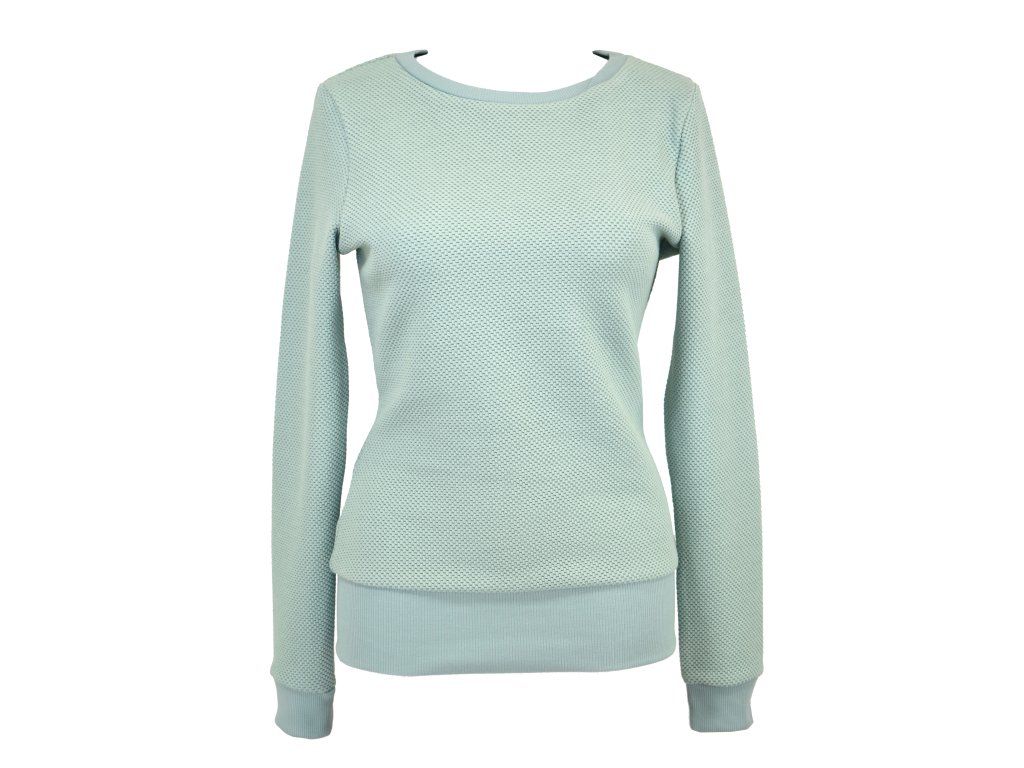 Dámská mikina prodloužené délky a s prodlouženými rukávy. Rovnější v pase, průkrčník a rukávy jsou lemované úpletem. Bez kapes.