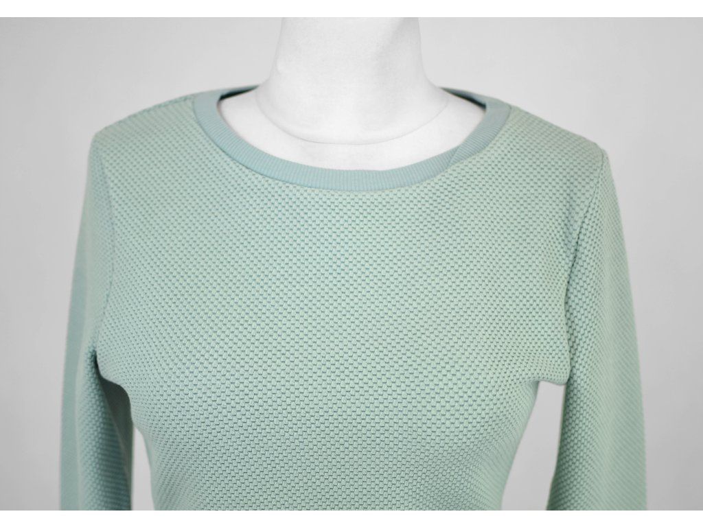 Dámská mikina prodloužené délky a s prodlouženými rukávy. Rovnější v pase, průkrčník a rukávy jsou lemované úpletem. Bez kapes.