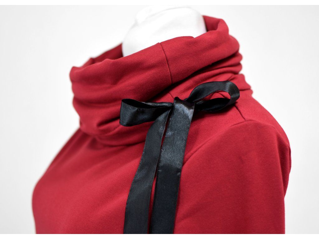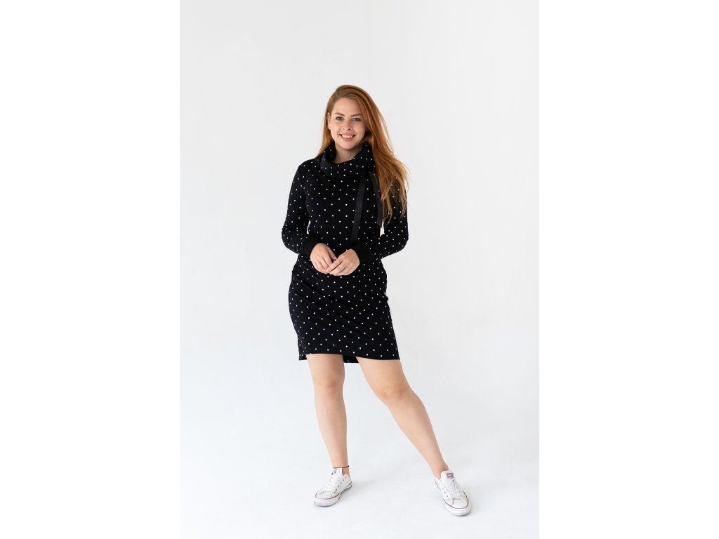 Mikinové šaty z úpletu s prodlouženou délkou rukávů, obřím límcem se stuhou na stažení, kapsy lemované nápletem. Zadní díl je prodloužený. Pohodlný sportovně-ležérní střih. Příjemný hřejivý kousek na chladné dny. Nositelné přes džíny či legíny... :)