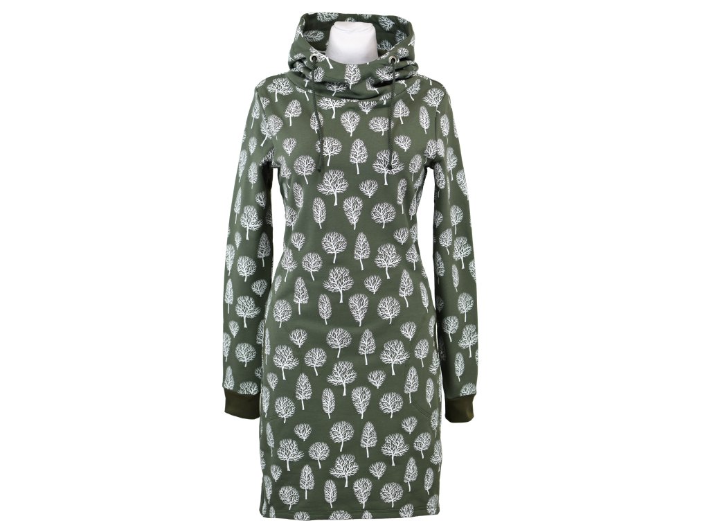 Mikinové šaty z úpletu s prodlouženou délkou rukávů, velkou kapucí se šňůrkami na stažení, kapsy lemované nápletem. Zadní díl je prodloužený. Pohodlný sportovně-ležérní střih. Příjemný hřejivý kousek na chladné dny. Nositelné přes džíny či legíny... :)